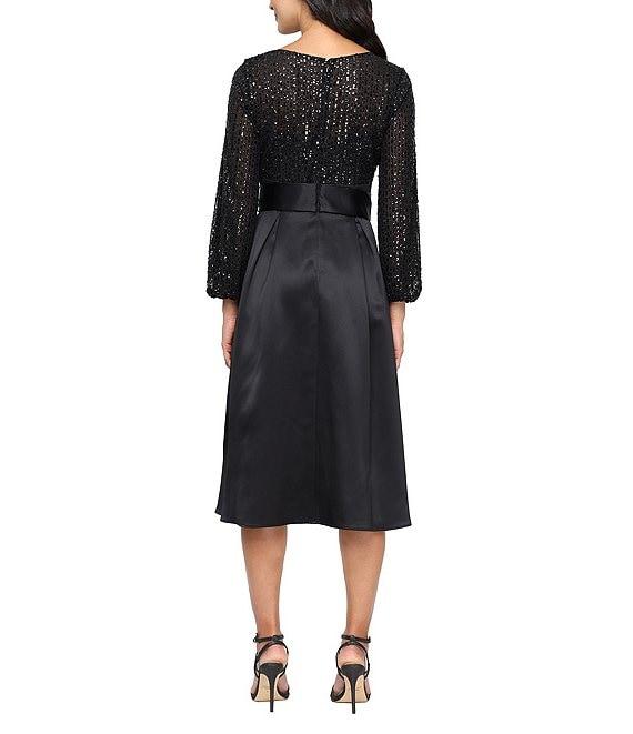 Alex Evenings Crepe Sequin 3/4 Sleeve Belted Satin Skirt A-Line Midi Dress