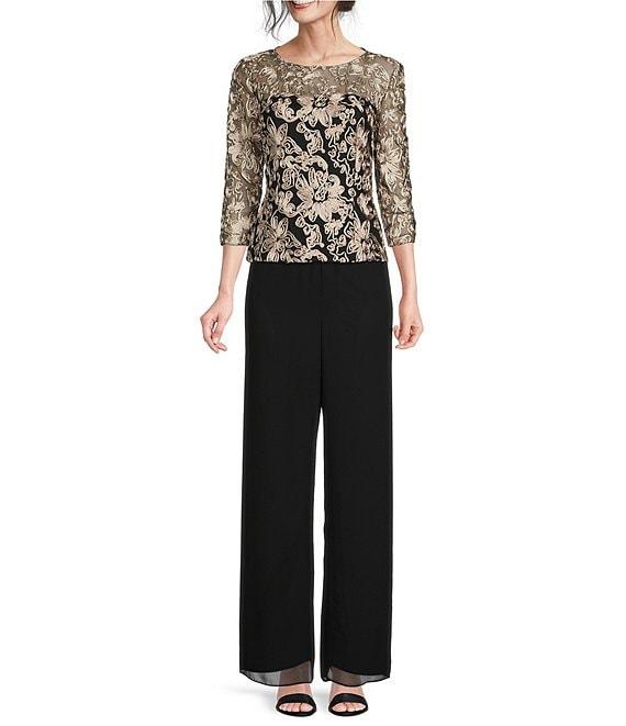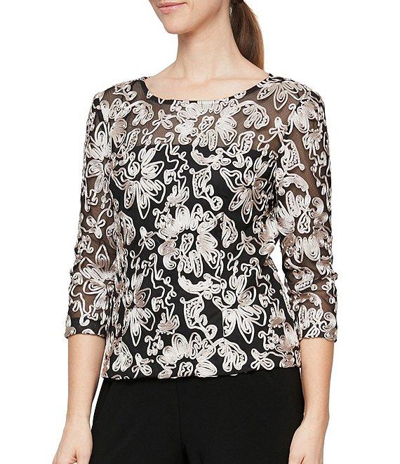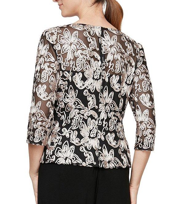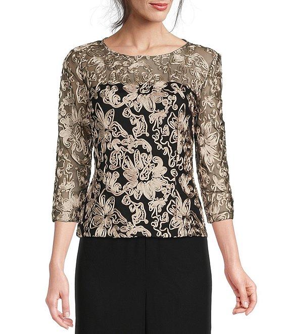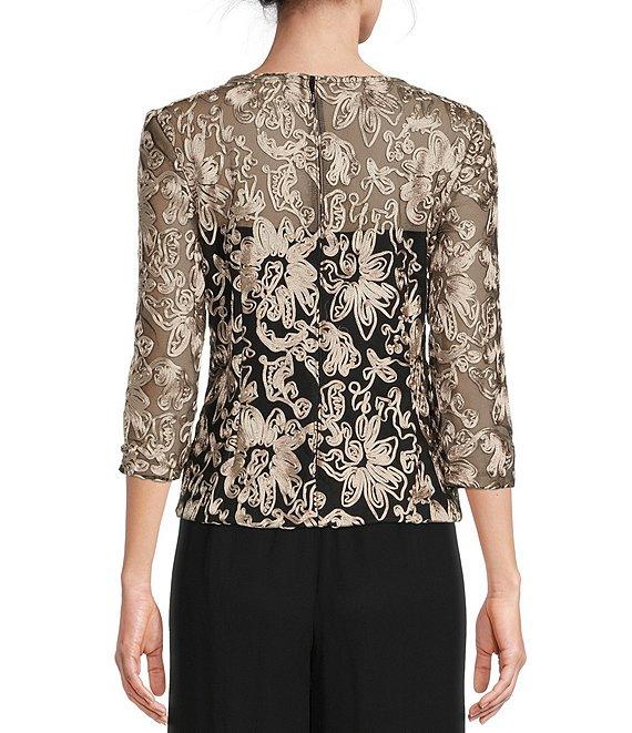 Alex Evenings Illusion Crew Neck 3/4 Sleeve Embroidered Floral Lace Top