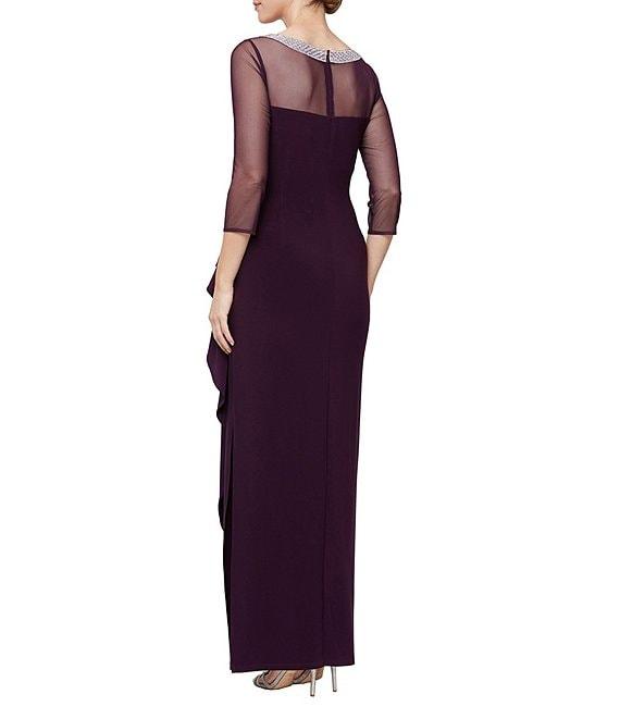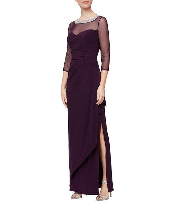 From Alex Evenings, this gown features: knit fabrication sheath silhouette illusion round neckline with embroidery and embellishments 3/4 illusion mesh sleeves ruching at side waist side slit center back zip closure approx. 57.25" in length polyester/spandex; mesh: polyester/spandex; lining: polyester hand wash cold separately/do not bleach/ lay flat to dry/do not iron/do not steam/do not dry clean Imported.