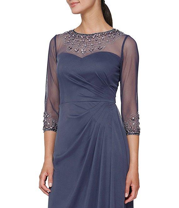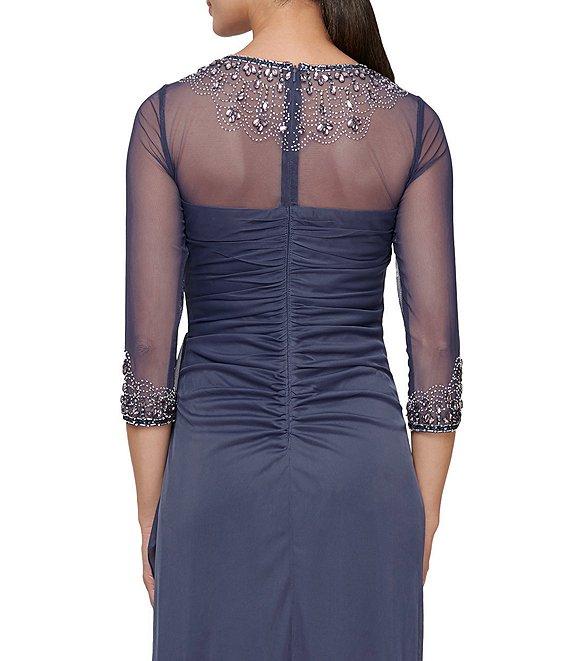 Alex Evenings Long Beaded Illusion Sweetheart Neck 3/4 Sleeve Ruched Dress