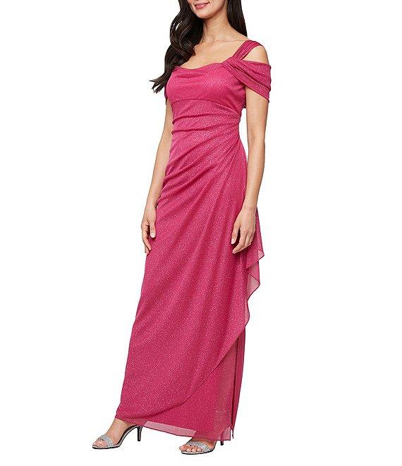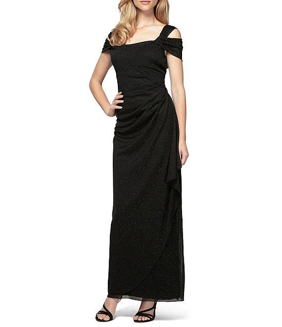 From Alex Evenings, this gown features:glitter mesh fabricationcowl necklinecold shoulder cap sleevesgentle side ruching detailback zipper closurepolyesterhand washImported.