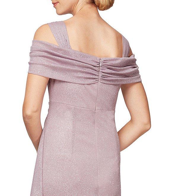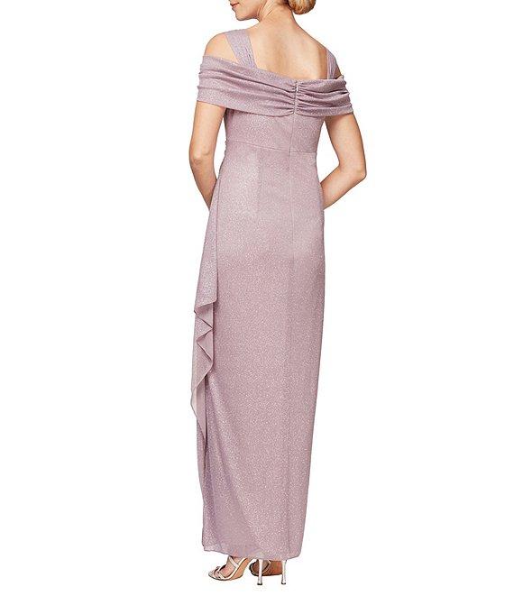 Alex Evenings Petite Size Cowl Square Neck Cap Sleeve Cold Shoulder Ruched Side Glitter Mesh Gown