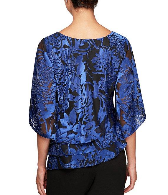 From Alex Evenings Petite, this blouse features: Chiffon fabrication boat neckline elbow length sleeves Floral print Asymmetrical tier hem Lined Pullover construction Approx. 21" in length Polyester/rayon Hand wash Imported.