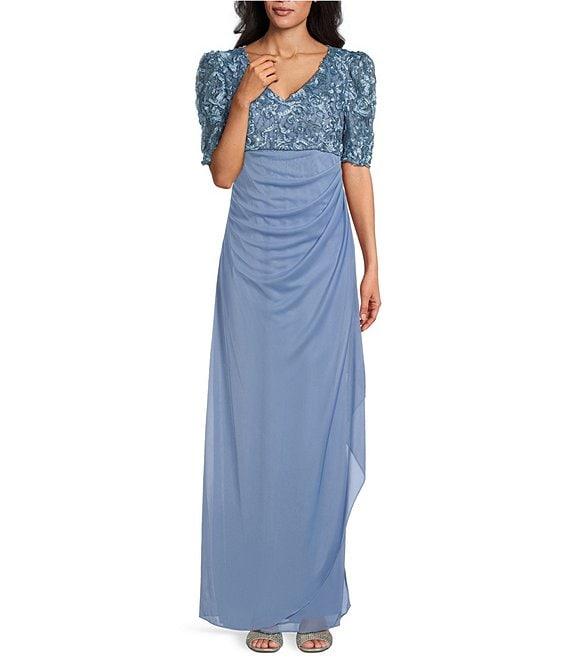 Alex Evenings Petite Size Lace Soutache Bodice V-Neck Short Sleeve Cascade Ruffle Empire Waist Dress