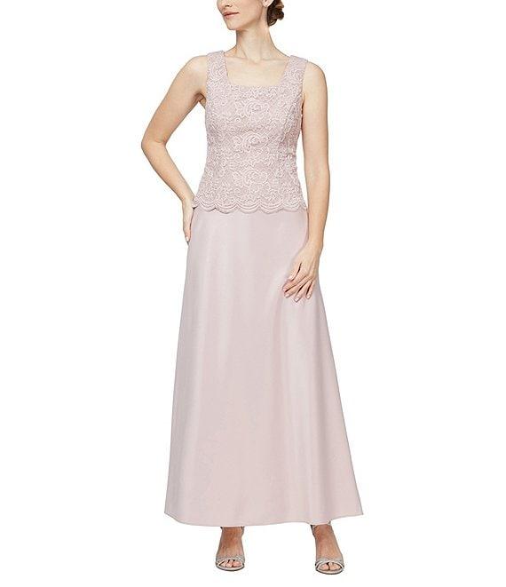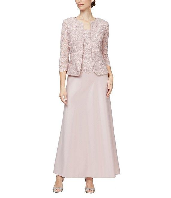 From Alex Evenings Petite, this 2-piece jacket dress features: Dress: glitter lace fabrication scoop neckline sleeveless scalloped bodice detail lined back zipper closure approx. 51" length based on size 8P skirt and lining: polyester; tank: polyester/nylon/spandex hand wash Jacket: glitter lace fabrication crew neckline 3/4 sleeves open front; no closure approx. 19.75" length based on size 8P polyester/nylon/spandex hand wash Imported.