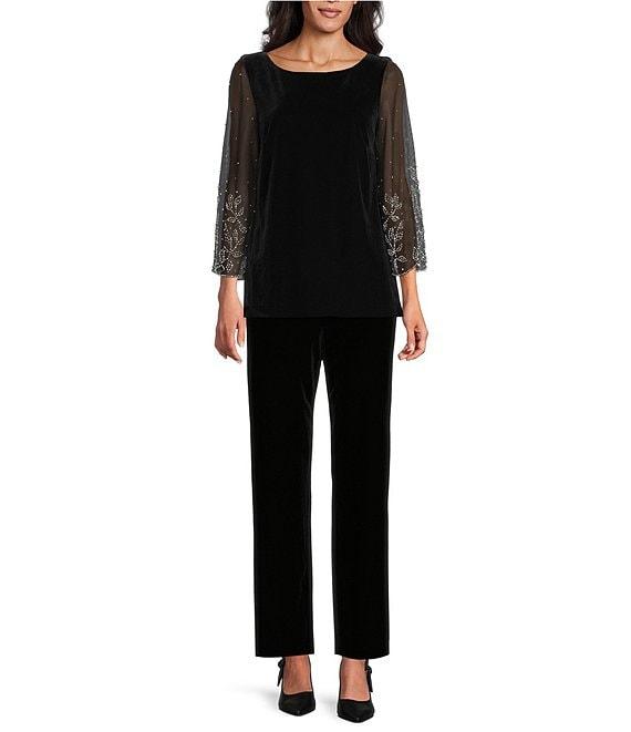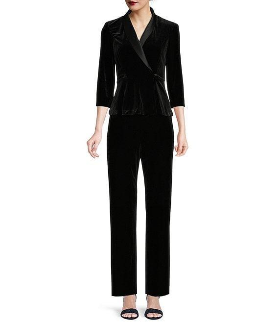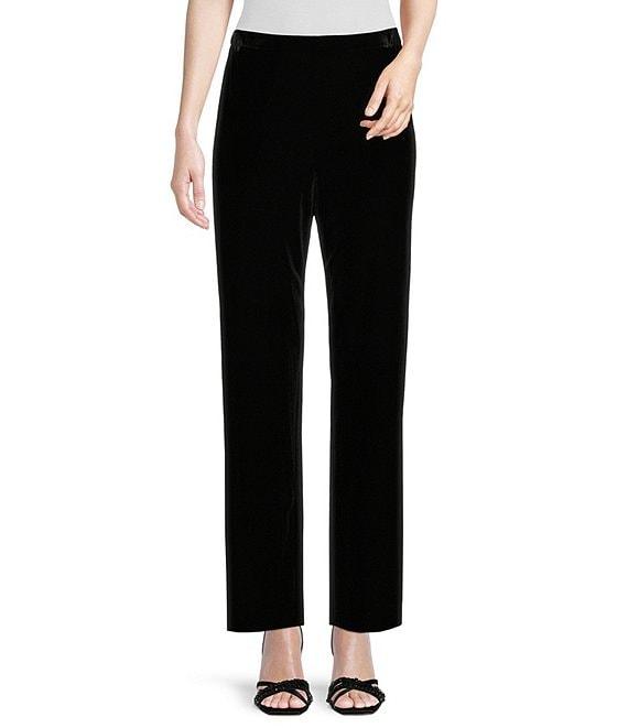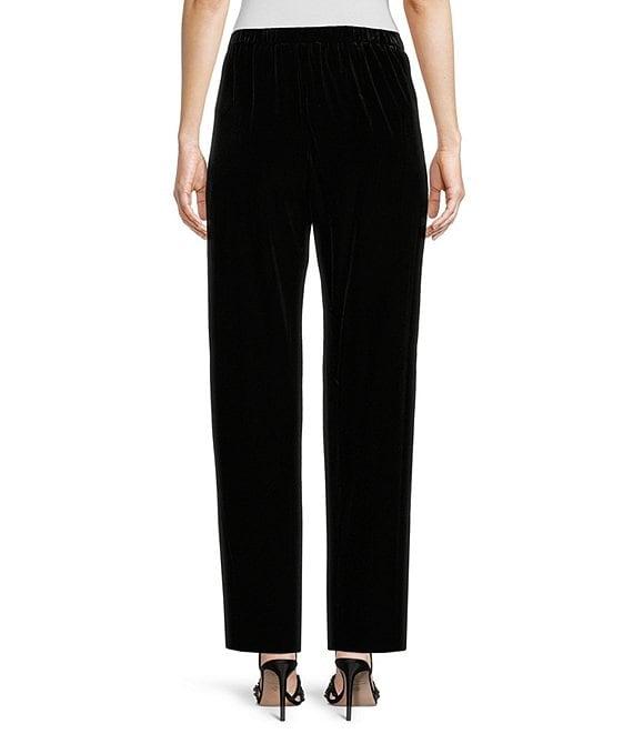From Alex Evenings Petite, these pants features: Stretch velvet fabrication Slim silhouette Elastic waistline Flat front Pull-on construction Approx. 35.5" length Polyester/spandex Dry clean Imported.