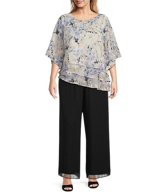 From Alex Evenings Plus, this blouse features: Chiffon fabrication Boat neckline 3/4 sleeves Lined Floral print Asymmetric tiered hem Pullover construction Approx. 25.625" in center back length Polyester Hand wash Imported.