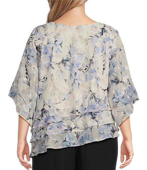 Alex Evenings Plus Size 3/4 Sleeve Boat Neck Asymmetrical Triple Tier Floral Chiffon Blouse