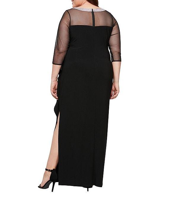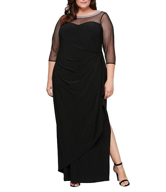 From Alex Evenings Plus, this dress features: Matte jersey/knit fabrication Round/embellished neckline Illusion sweetheart neckline Illusion 3/4 sleeves Embroidered Embellished neckline Ruched detail Lined Center back zip closure Approx. 57" length Polyester/spandex Hand wash cold/flat dry Imported.