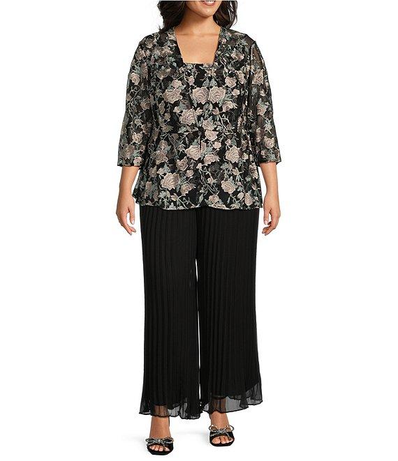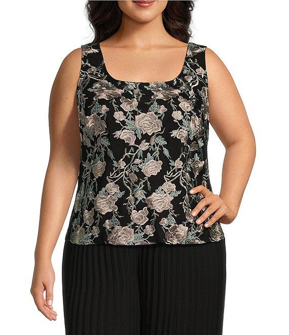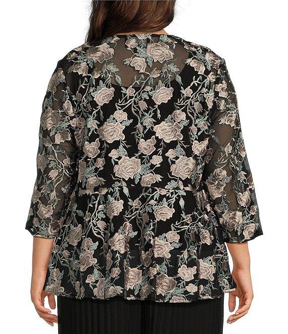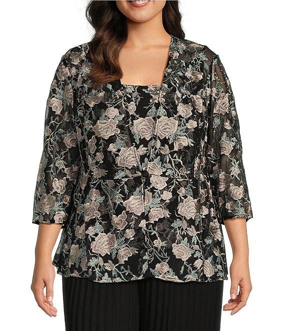 From Alex Evenings Plus, this twinset features: Jacket: Stretch tulle fabrication V-neckline 3/4 sleeves Floral print Front button closure Approx. 26" length Polyester/spandex Hand wash Top: Stretch tulle fabrication Tank top silhouette Sleeveless Square neckline Floral print Lined Pullover construction Approx. 26" length Polyester/spandex Hand wash Imported.