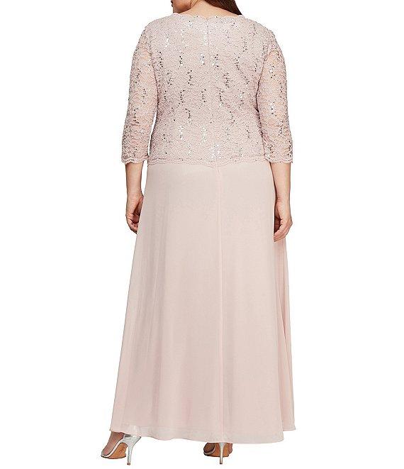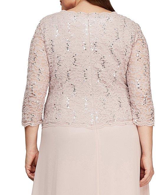 From Alex Evenings Plus, this gown features: lace & chiffon fabrication Crew neckline 3/4 illusion sleeves sequin lace bodice 1 piece design zip back closure nylon/polyester/spandex hand wash Imported.