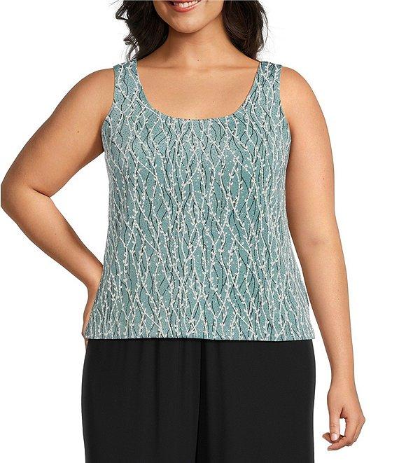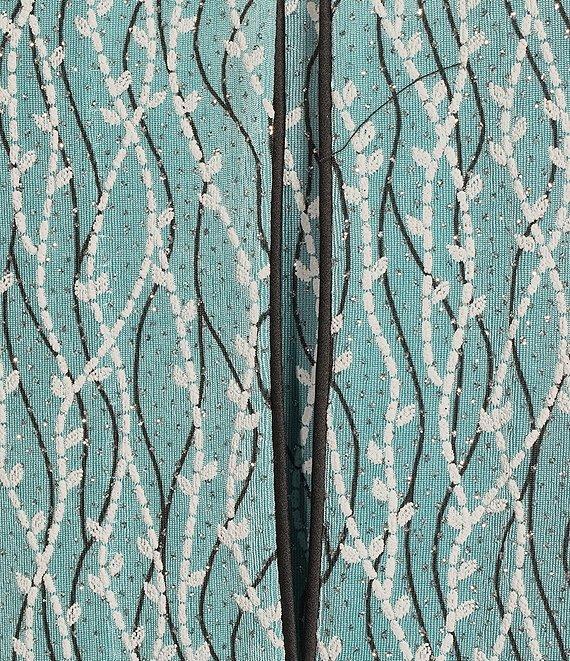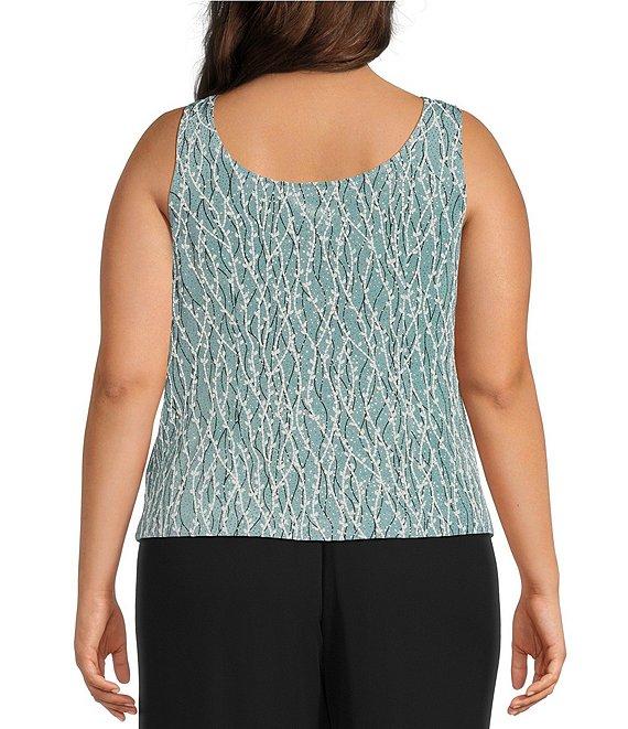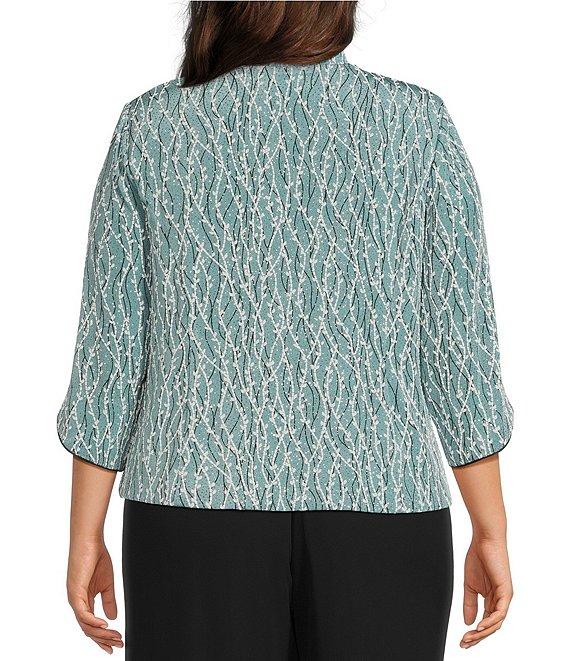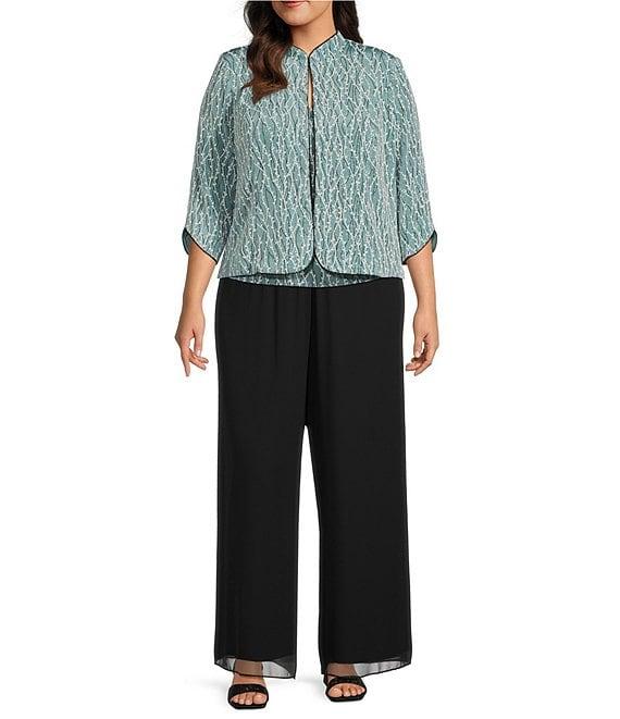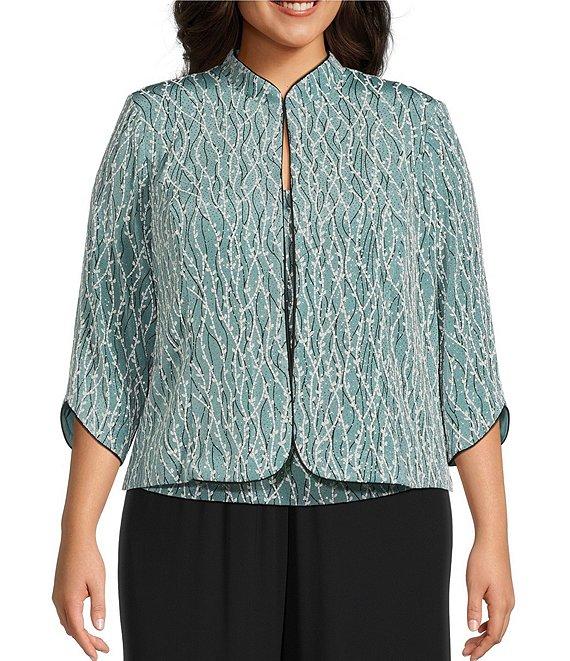 From Alex Evenings Plus, this twinset features: Jacket Glitter jersey knit fabrication Mandarin collar neckline 3/4 sleeve jacket Contrast piping Shoulder pads Trim/lining: polyester Hook and eye front closure Approx. 25" center back length Acetate/spandex Hand wash cold/flat dry Tank Glitter jersey knit fabrication Square neckline Sleeveless Pullover construction Approx. 24.5" center back length Acetate/spandex Hand wash Made in the USA.