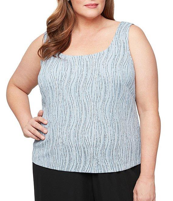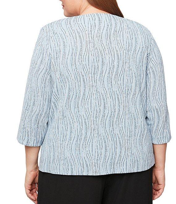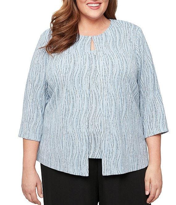 From Alex Evenings Plus, this twinset features: Jacket: Printed jacquard knit fabrication Open front neckline 3/4 sleeves Lined Hook front closure Approx. 25" in center back length Polyester/spandex Hand wash Top: Printed jacquard knit fabrication Scoop neckline Sleeveless Pullover construction Polyester/spandex Hand wash Imported.