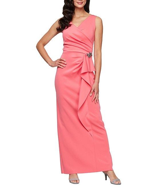 From Alex Evenings, this gown features: Scuba crepe fabrication V-neckline Sleeveless Sheath silhouette Beaded detail at hip Cascading ruffle Ruched waist Zipper back closure Approx. 51" in length Polyester/spandex Hand wash Imported.