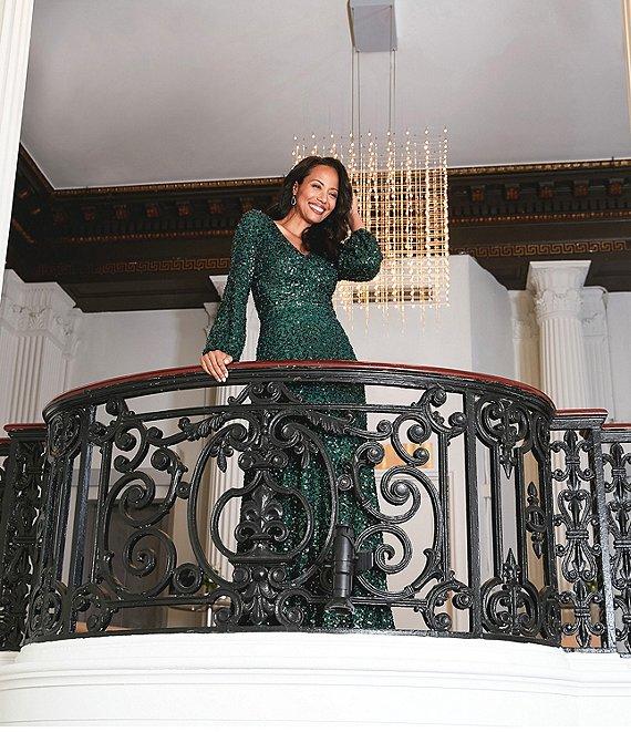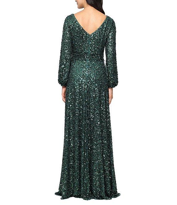 Alex Evenings Sequin V-Neck Bubble Hem Long Sleeve A-Line Gown