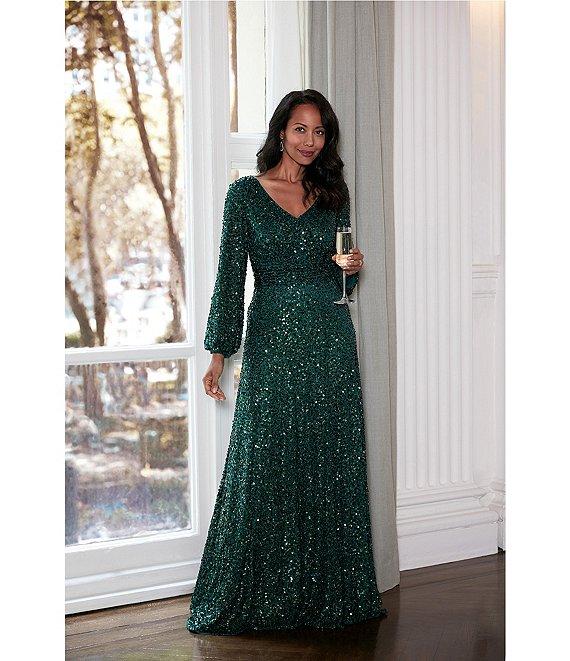 From Alex Evenings, this dress features: Sequin fabrication V-neckline Long sleeves A-line silhouette Bubble hem sleeves Lined Center back zipper closure Approx. 51" in length Polyester/spandex Hand wash/dry flat Imported.