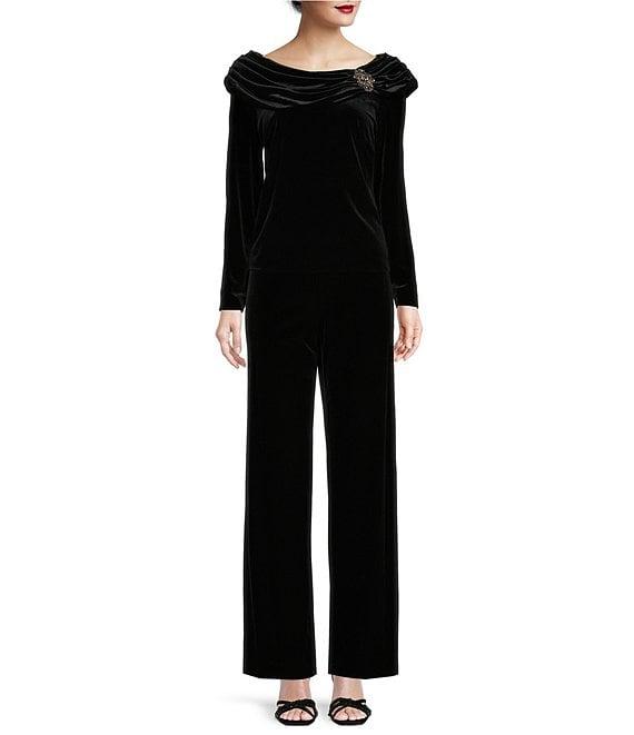 From Alex Evenings, these pants feature: Stretch velvet fabrication Straight leg silhouette Flat front Pull-on construction Approx. 41.25" inseam Polyester/spandex Dry clean Imported.