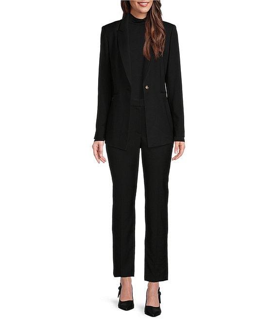 From Alex Marie, these pants feature:Straight leg silhouetteFlat front high rise waistbandFront hook and zip closureApprox. 28.25" inseamPolyester/rayon/elastaneMachine wash/line dryImported.