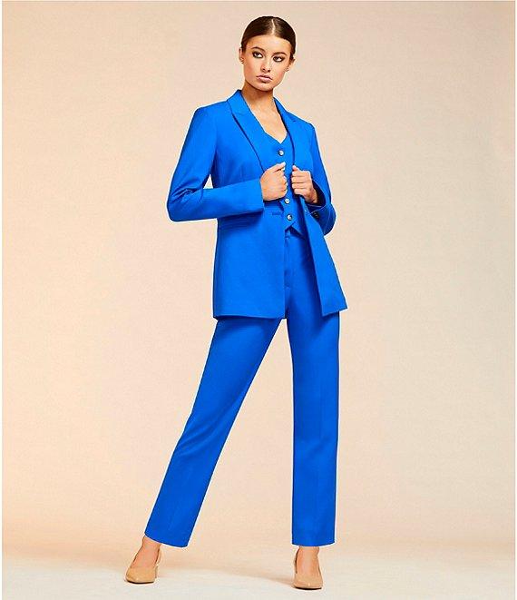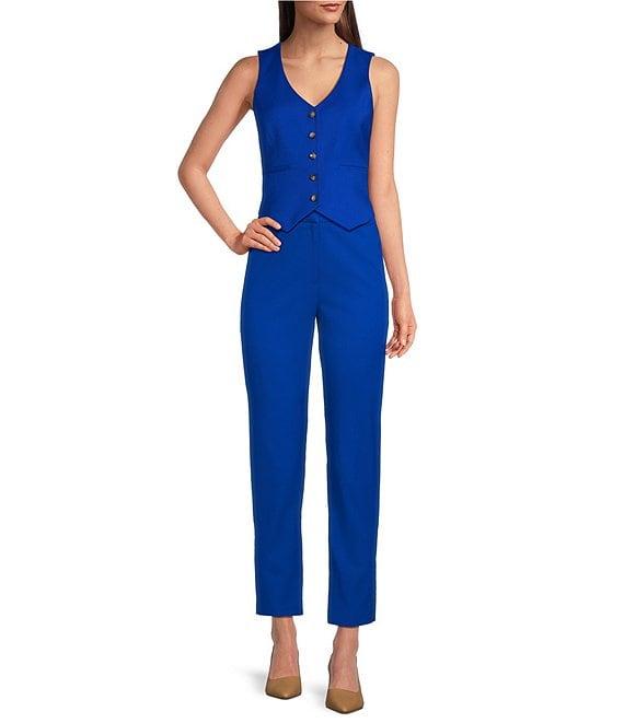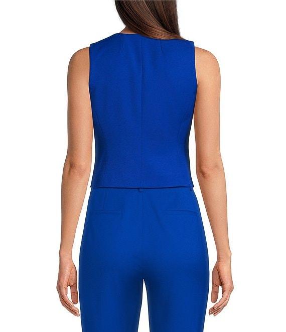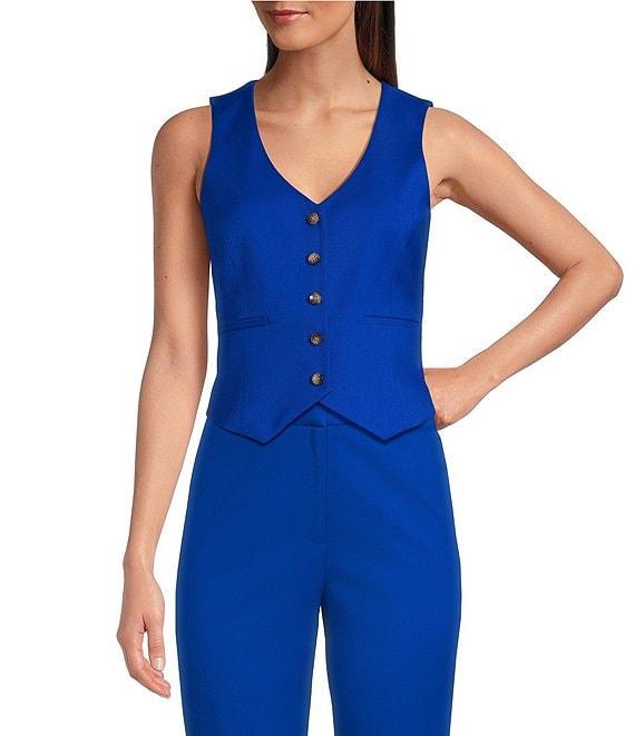 From Alex Marie, this vest features: V-neckline Sleeveless Lined Button front Approx. 17" length Polyester/rayon/elastane Machine wash/line dry Imported.