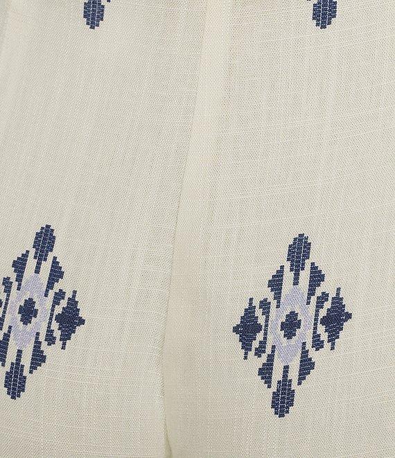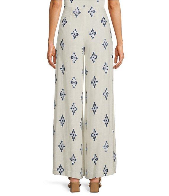 From Alex Marie, these pants feature: Printed linen fabrication Flat front silhouette Full length Wide leg Lined Side hook/zip Approx. 31" inseam Linen/viscose Machine wash / line dry Imported.