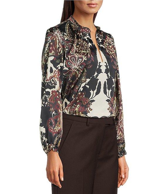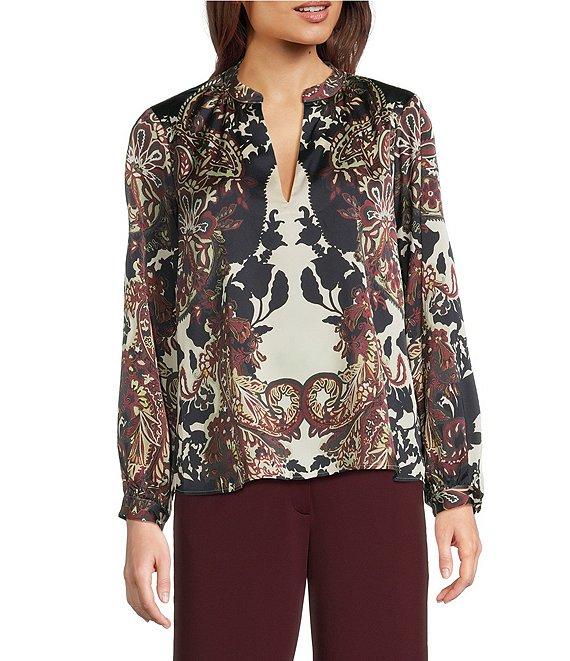 From Alex Marie, this blouse features: Printed satin fabrication Long sleeves Blouse silhouette Pullover construction Approx. 26.5" length Polyester Machine wash/line dry Imported.