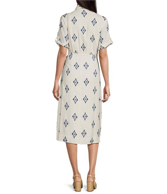 From Alex Marie, this dress features:Printed linen fabricationButton down collarShort sleevesMidi lengthLinedSide zipApprox. 46.5" lengthViscose/linenMachine wash/line dryImported.