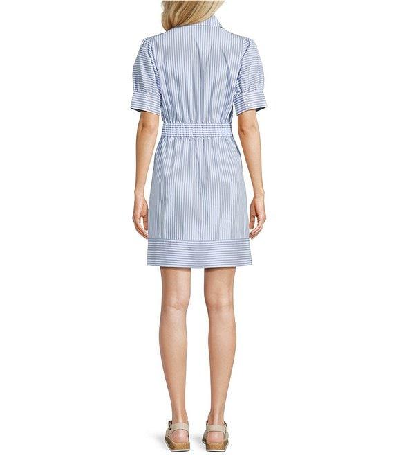 From Alex Marie Dressline, this dress features: Striped poplin fabrication Collar neckline Short sleeve 11 faux shell button center front, 4 faux shell button closure Length approx. 35.25" 69% cotton, 28% polyester, 3% elastane fiber content Dry clean Dillard's Exclusive Imported.