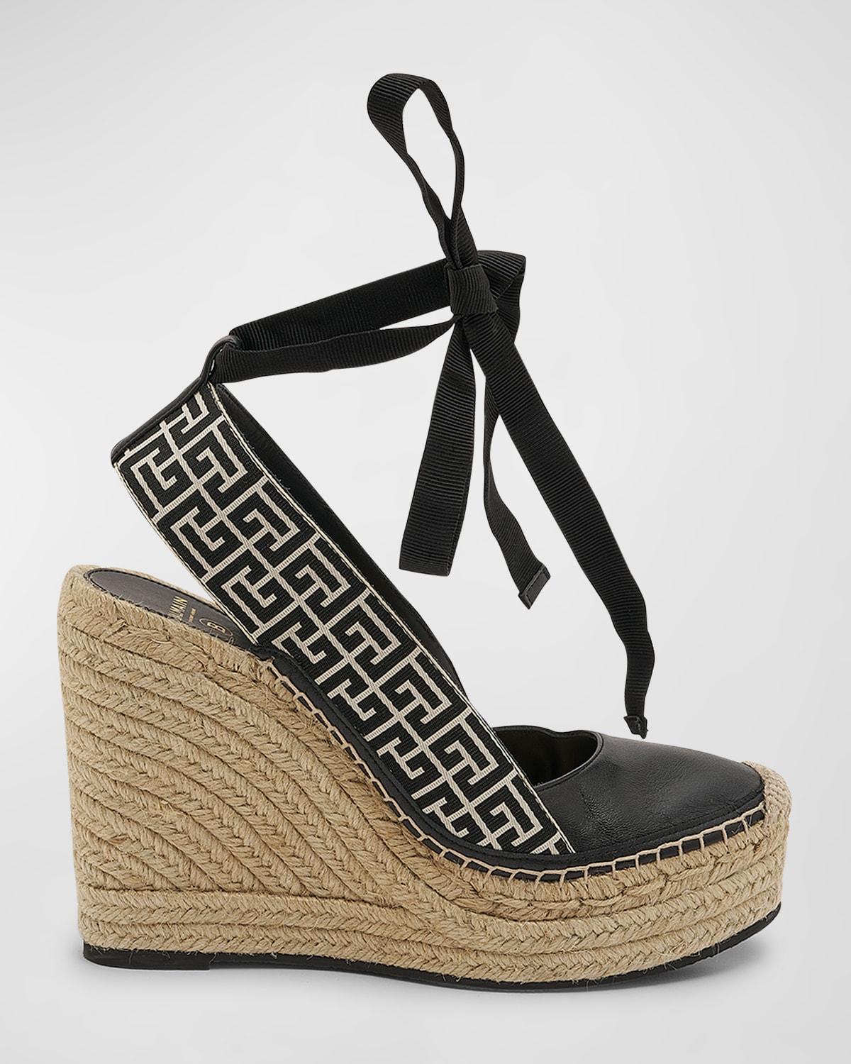 Styled with a monogram jacquard upper with a leather capped toe, these Alex wedges from Balmain are defined by an espadrille heel and an ankle wrap tie. Round toe Ankle-wrap closure Textile/leather upper Leather lining Rubber sole Made in Spain SIZE Espadrille wedges: about 3.75 (95mm) ABOUT THE BRAND In 1945, founder Pierre Balmain made his well-received debut of opulent, ultra-feminine designs. Known today for its iconic blazers, impeccably constructed dresses and signature fragrances, the brand continues its dedication to masterful tailoring and elegance under the helm of Creative Director Olivier Rousteing. Womens Shoes - Advanced Womens Designe > Balmain > Saks Fifth Avenue > Barneys. Balmain. Color: Noir. Size: 6.