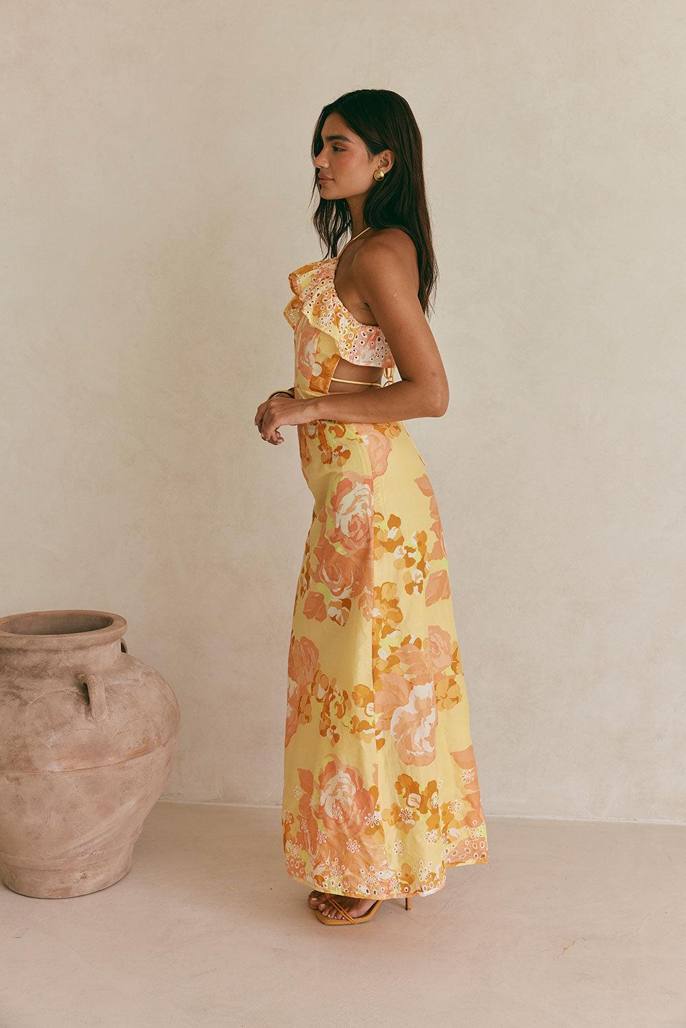 We've got your next event sorted! The Alexa Dress is made from a natural cotton voile fabric with our exclusive Breeze Floral print. It features thin rouleau halter neck ties, frill across neckline and back ties, open back detail, fitted waist, full length skirt and broidery details at hem. Elevate your look an upstyle and heels! Designed exclusively by Sabo.