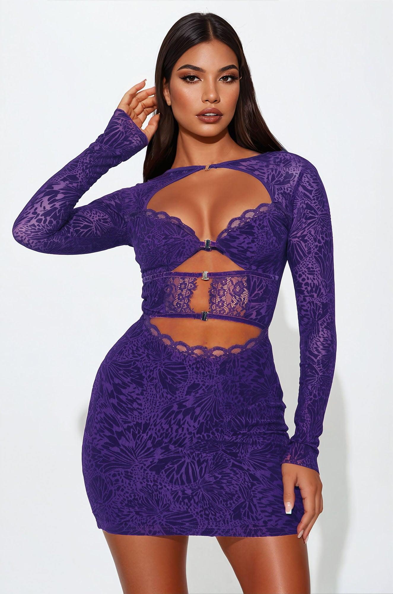 Available In Plum. Mesh Mini Dress Velvet Burnout Long Sleeve Sweetheart Neckline Lace Trim Clasp Closures Cut Outs Half Lined Stretch Length = 33" Disclaimer: Placement Of Burnout Will Vary Shell: 95% Polyester 5% Spandex Lining: 100% Polyester Imported California Proposition 65WARNING: Cancer and Reproductive Harm - www.P65Warnings.ca.gov.