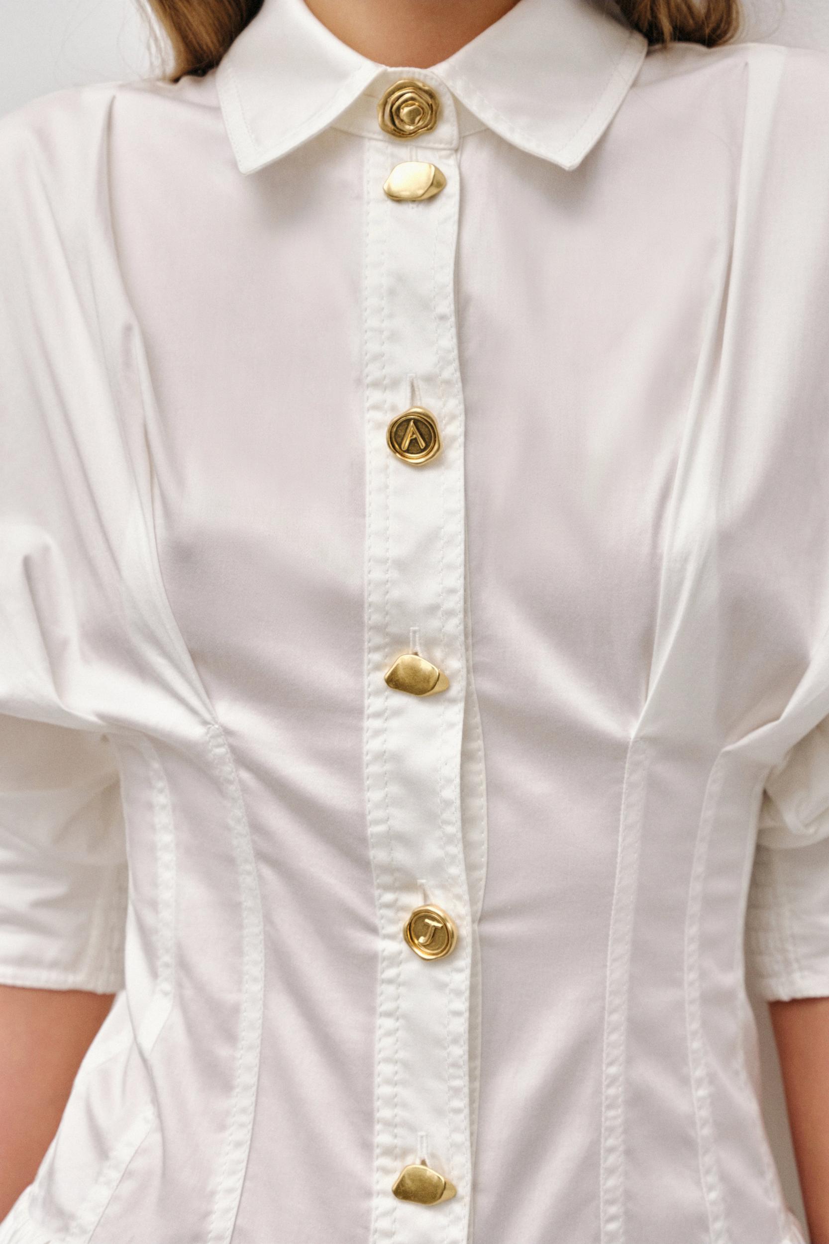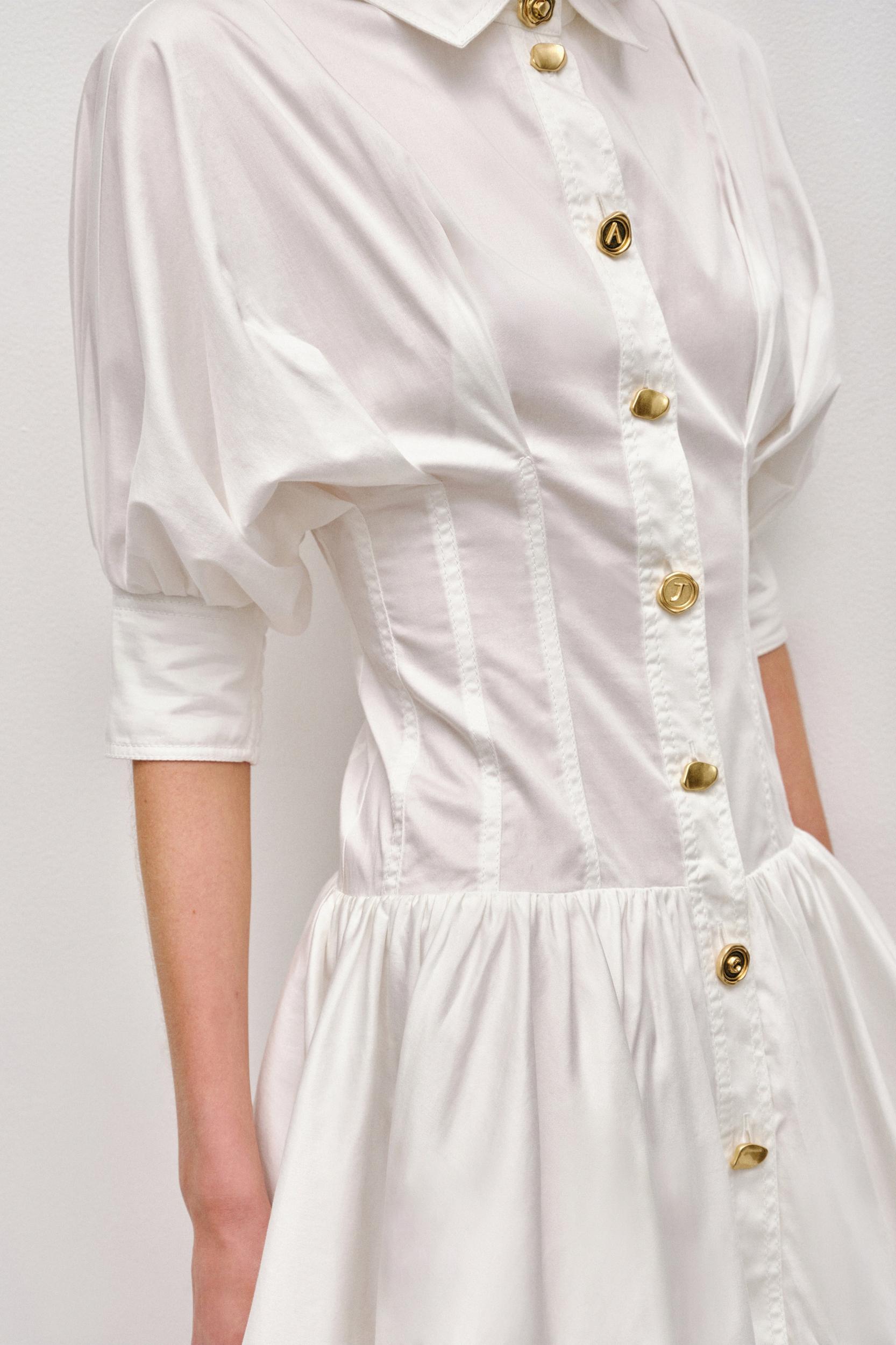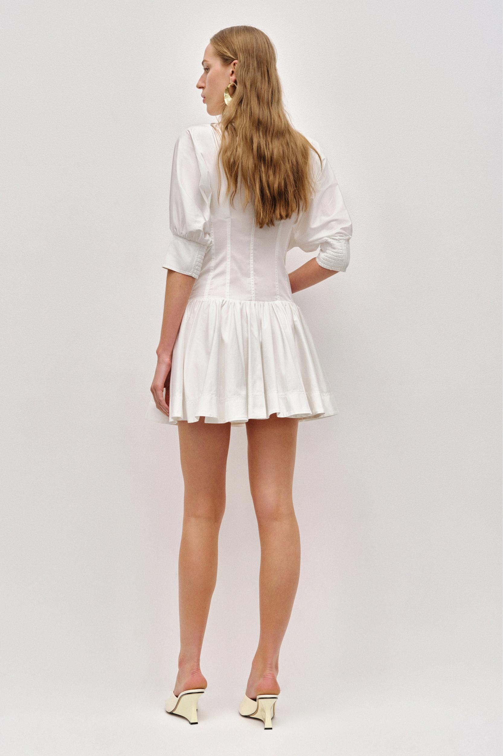 PRODUCT DETAILS Women's mini dress Shirt collar and placket with feature buttons Short raglan puff sleeves Sleeve cuffs with self covered button closure Fitted waist with twin needle topstitched panel seams Gathered hem frill Lined style 97% Cotton, 3% Elastane Delicate Cold Hand Wash Separately Shop All Dresses SIZE AND FIT Model wears a size AU 8/S Height: 180cm/ 5'11 Bust: 31cm Waist: 23cm Hips: 34cm