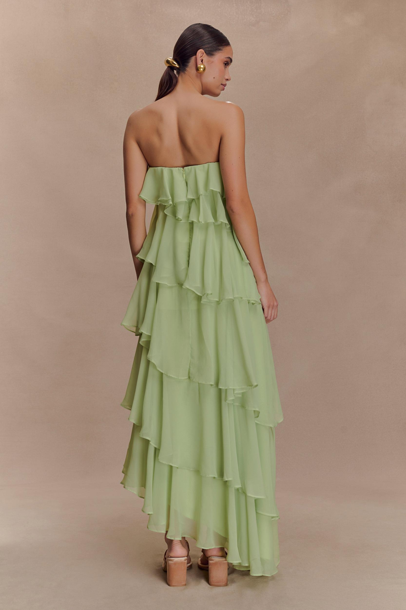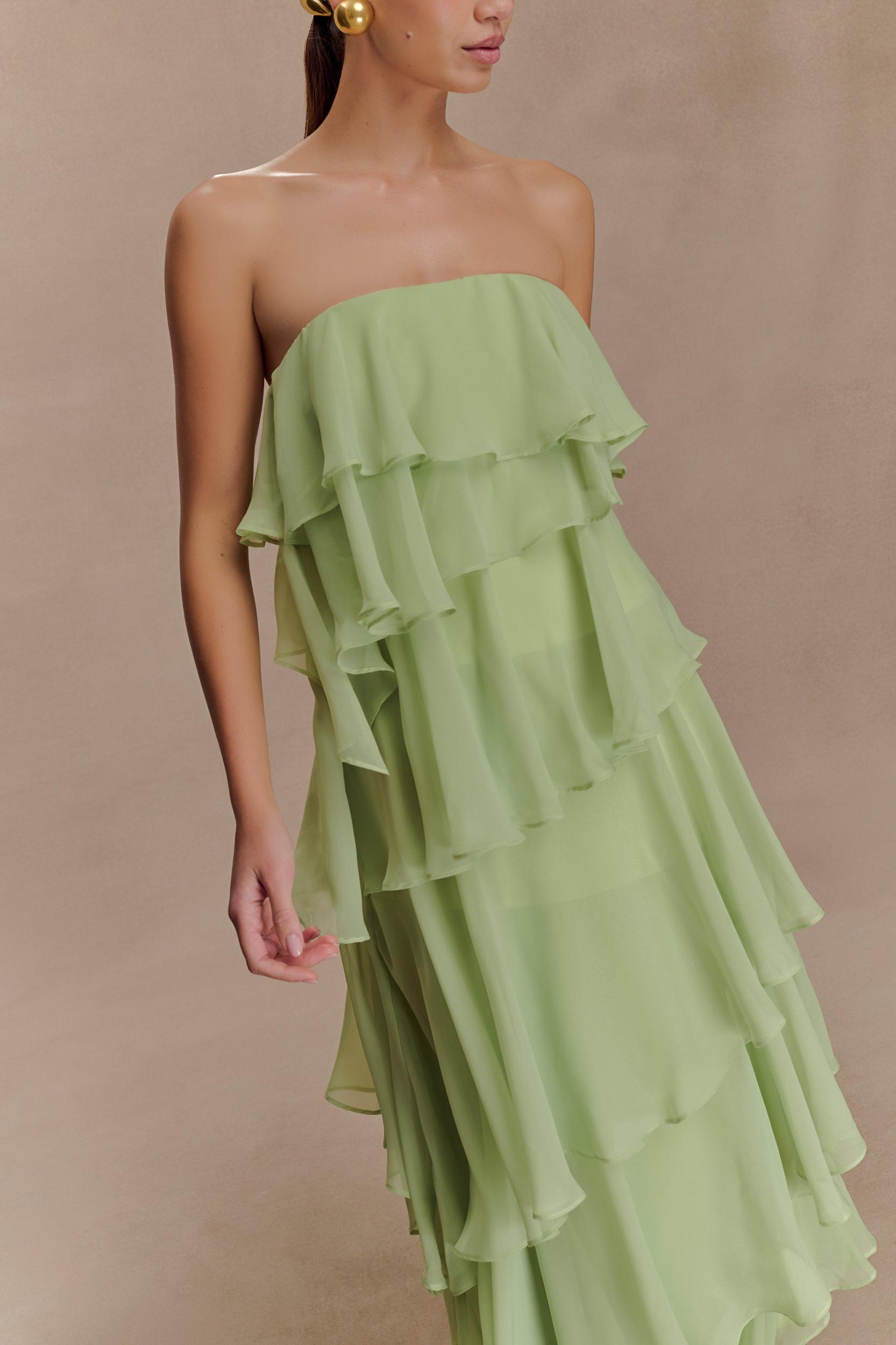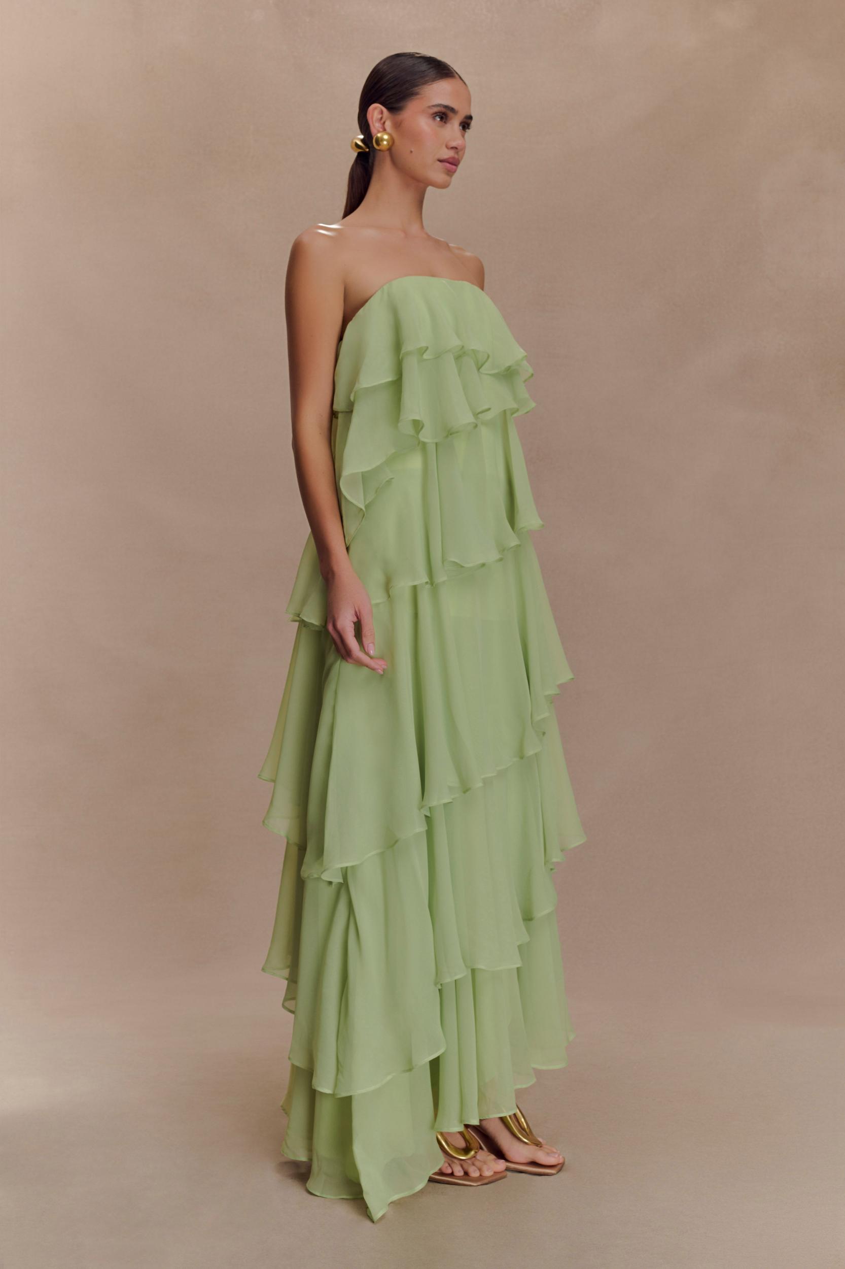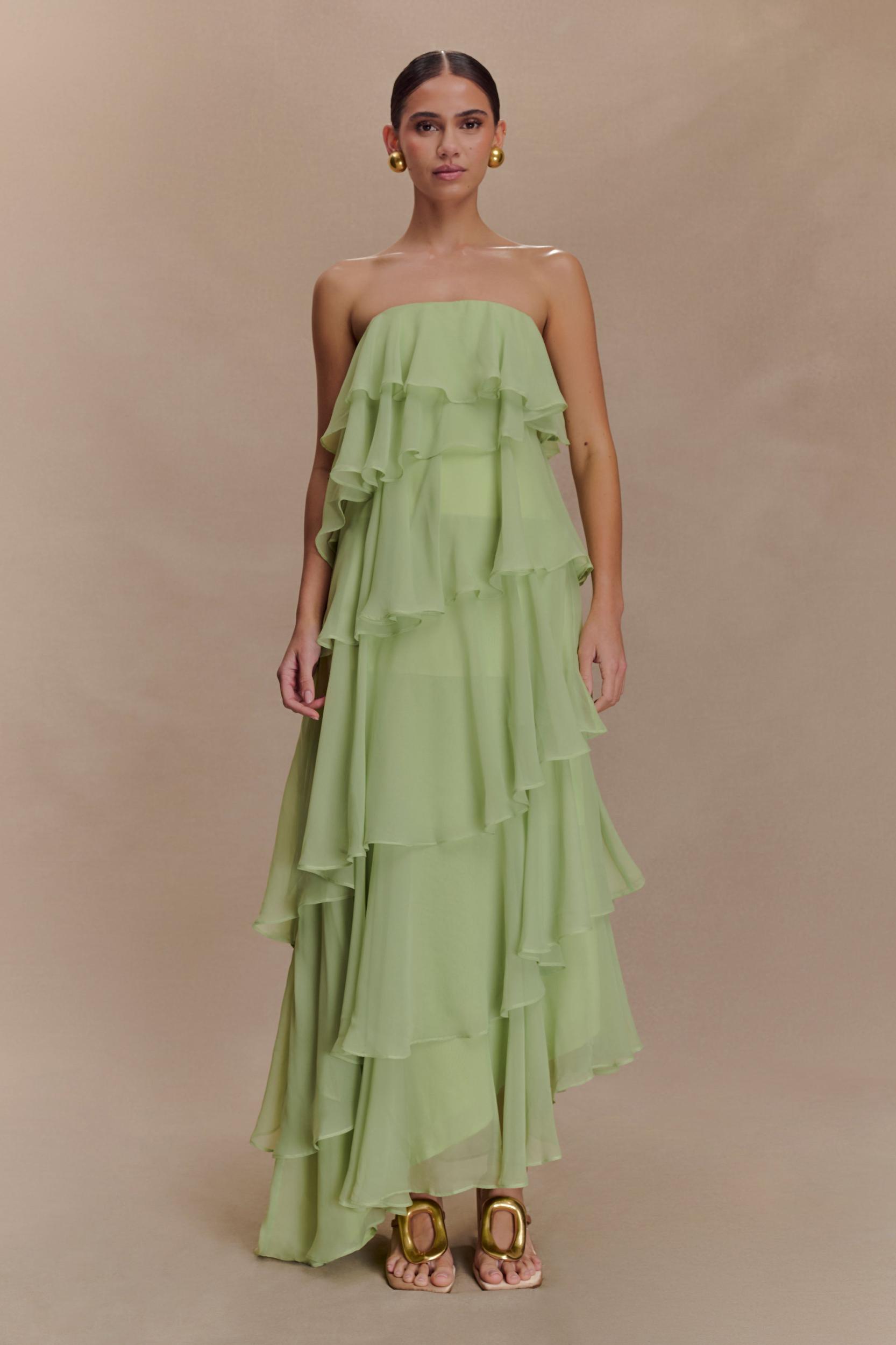 Step soft, float far. The ALEXA Ruffle Chiffon Maxi Dress is a romantic staple designed to move with ease and elegance. This strapless silhouette features a relaxed A-line fit with tiered chiffon layers that cascade into an asymmetrical hemline, creating soft volume and fluid motion. Fully lined with an invisible centre back zipper for a seamless finish, this dress is perfect for both elevated everyday wear and special occasion moments.