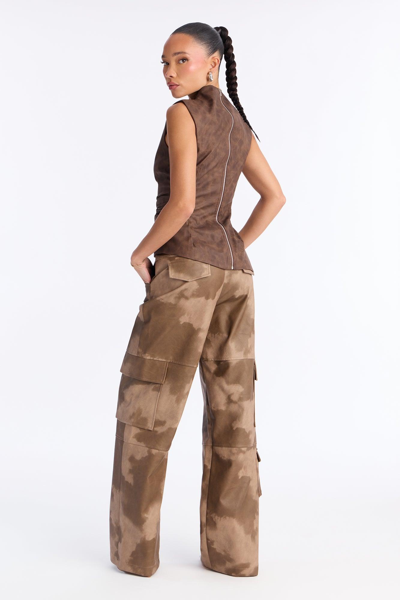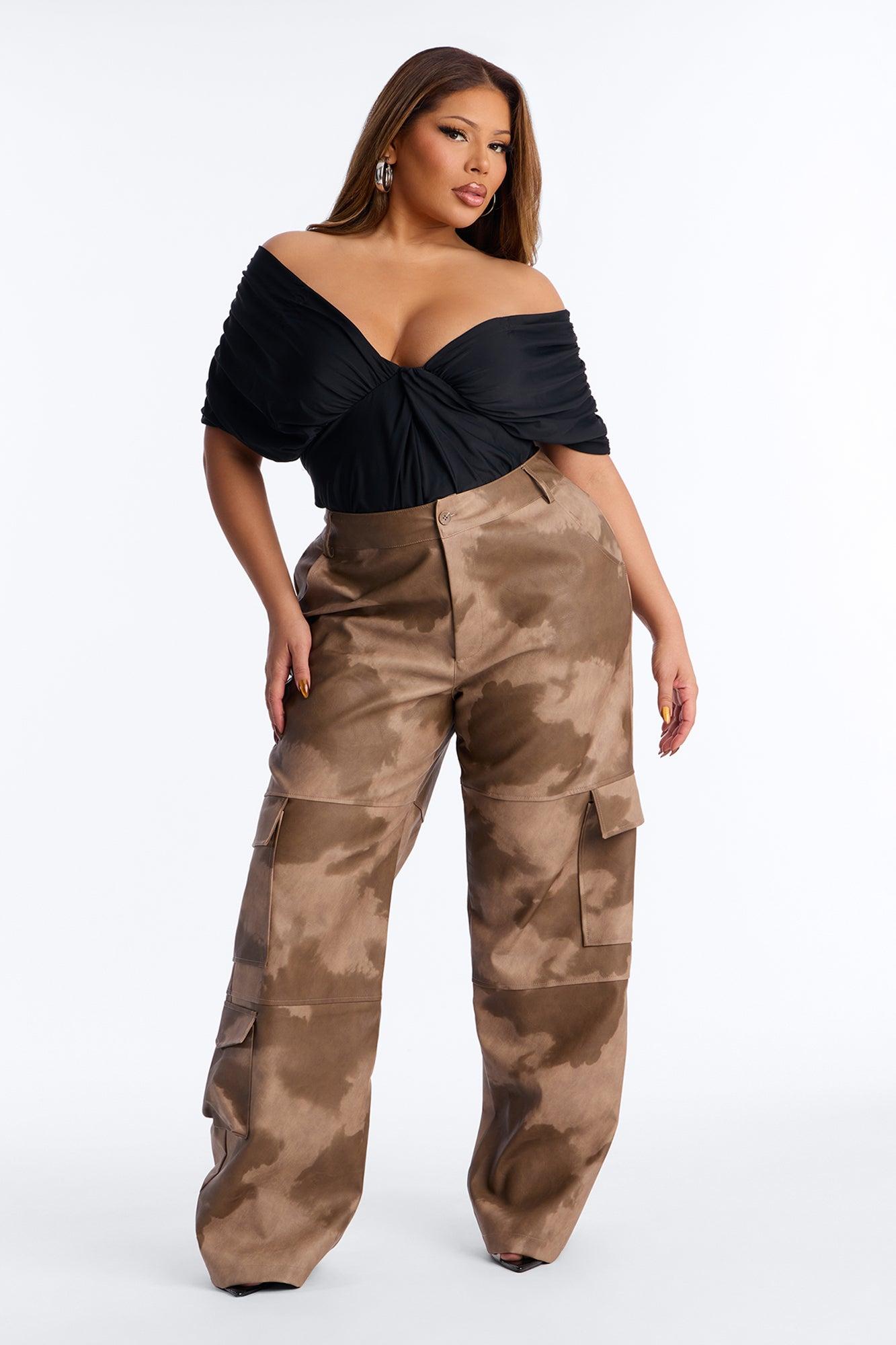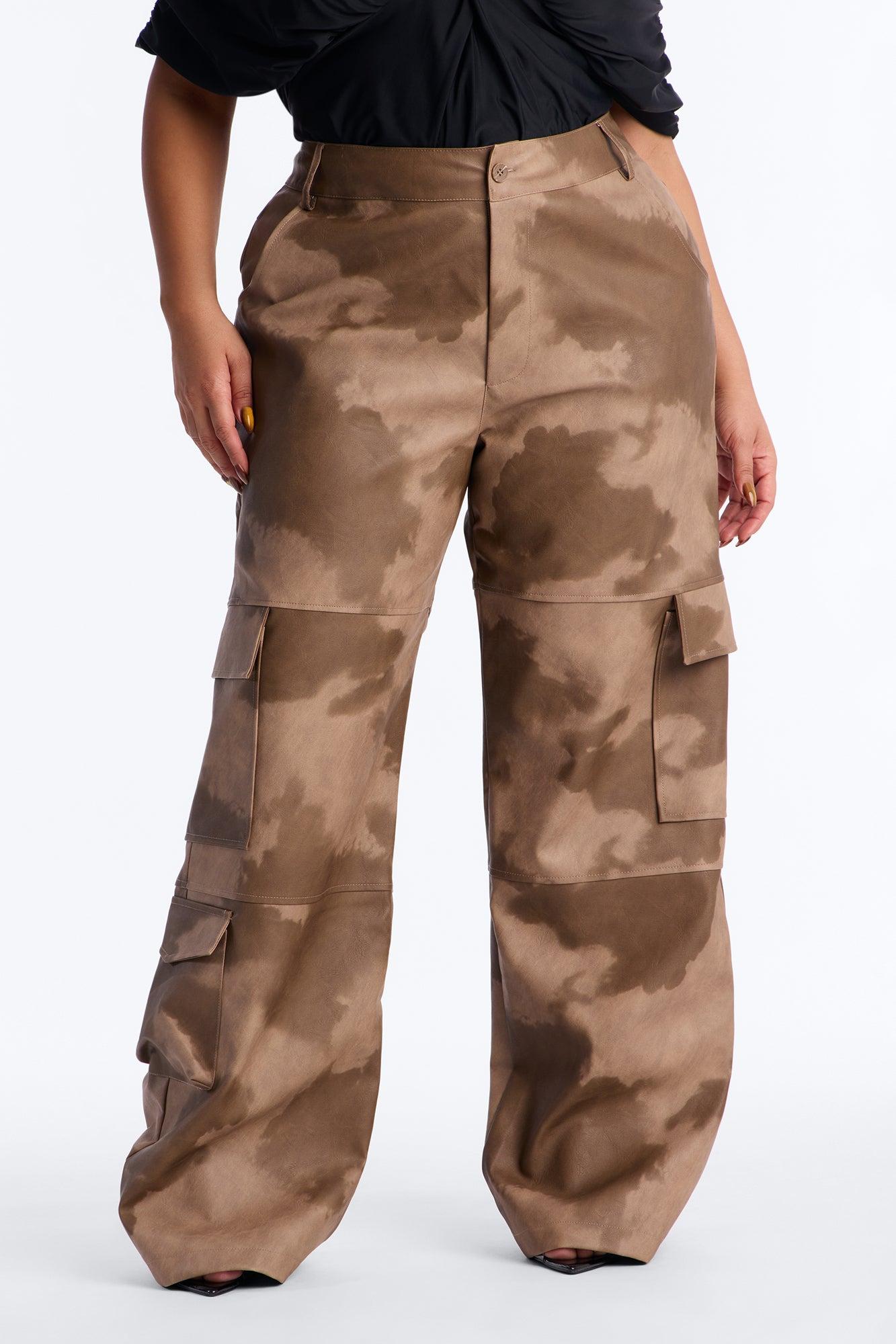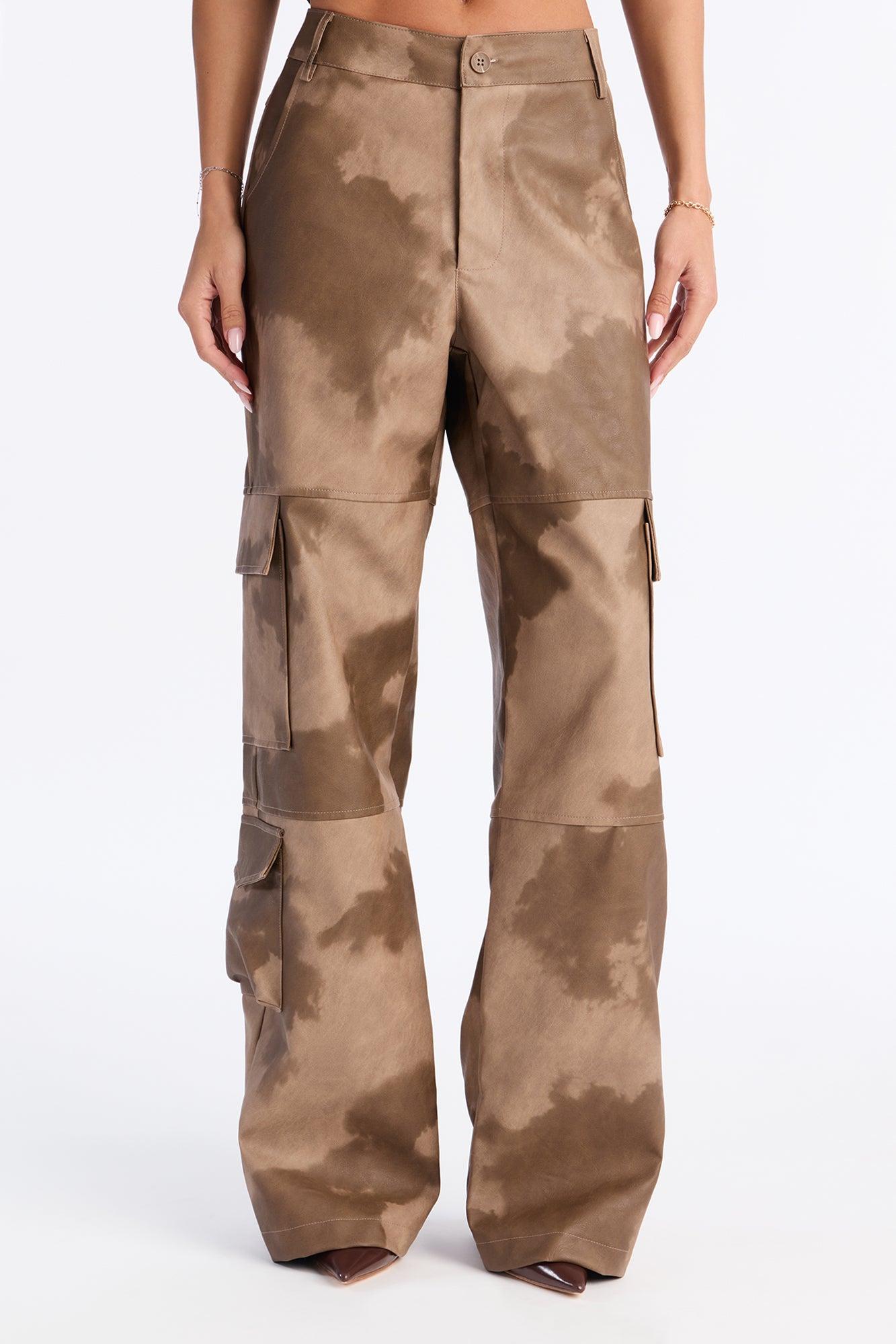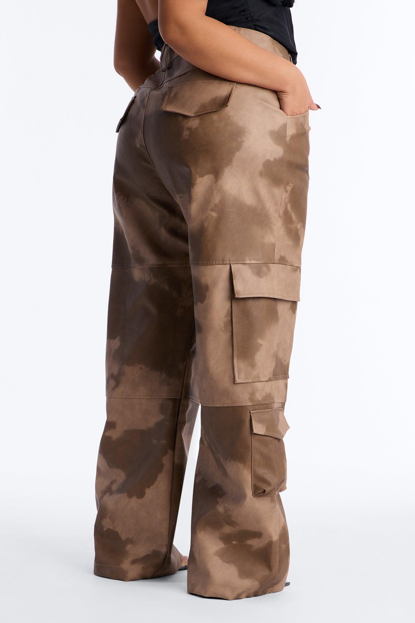 Available In Black And Chocolate. Wide Leg Pant Mid Rise Button & Zip Closure Side Pocket Cargo Pocket Faux Leather Distressed Wash Oversized Fit at Leg Non Stretch Self Coating: 100% Polyurethane Backing/Lining: 100% Polyester Imported California Proposition 65WARNING: Cancer and Reproductive Harm - www.P65Warnings.ca.gov.