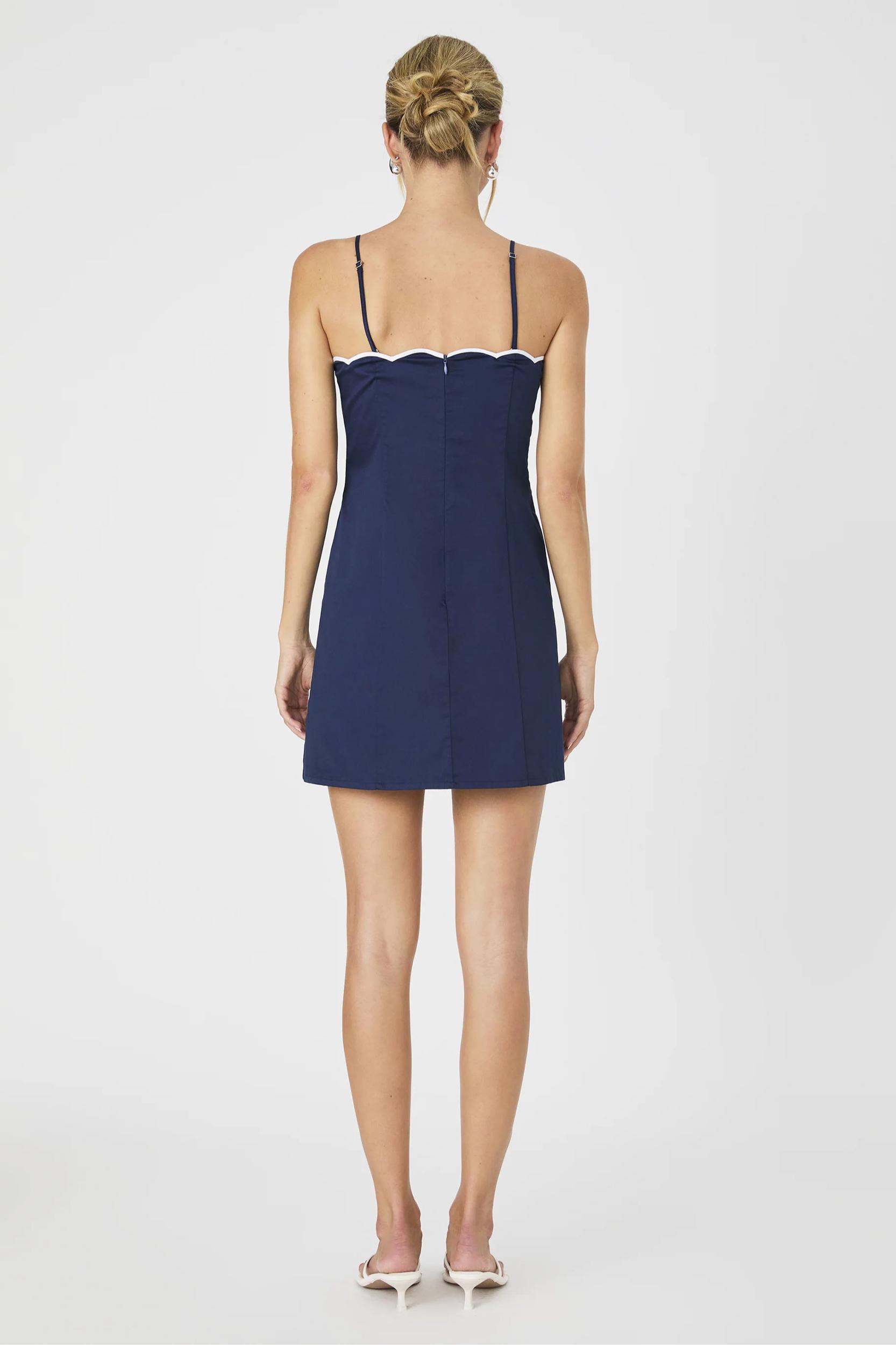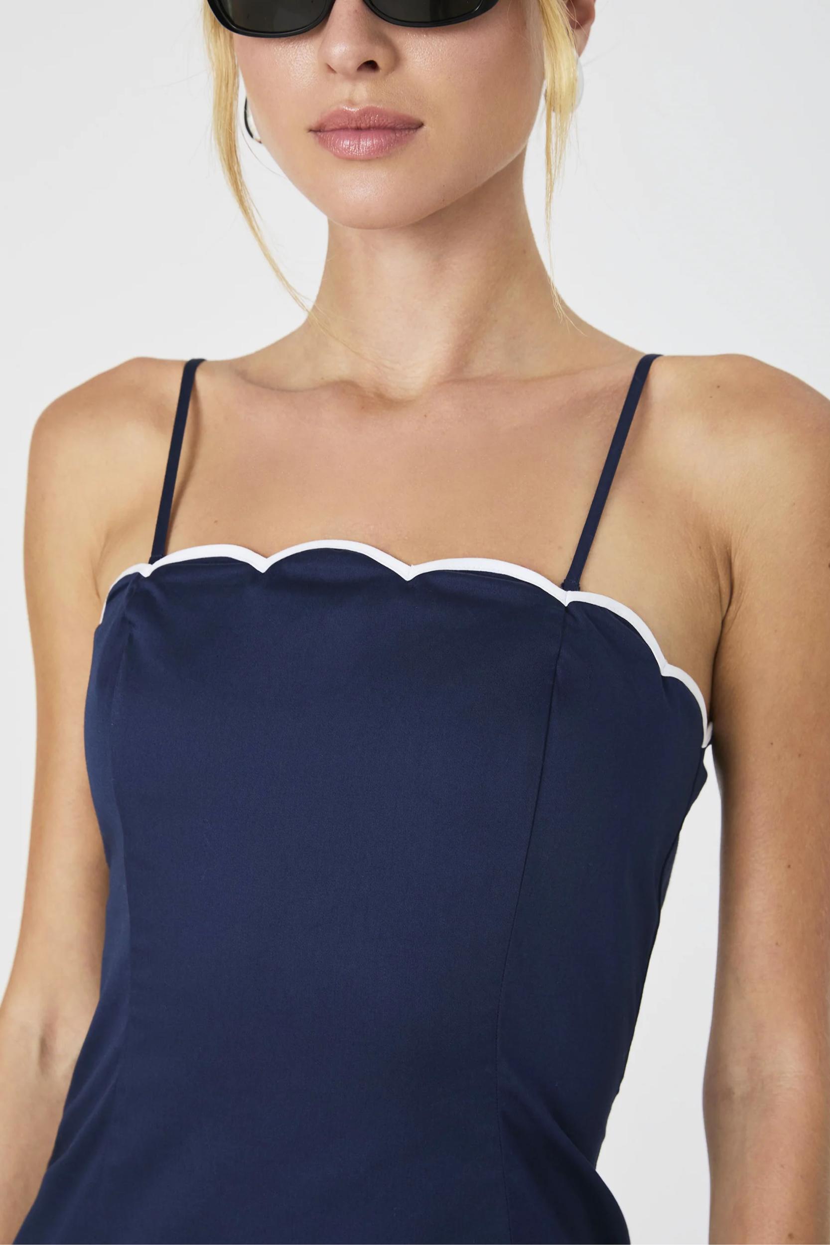 Step into the sun with the Alexis Cotton Scallop Mini Dress. Featuring a contrasting piped scallop neckline and adjustable straps, this dress is a warm weather essential. Pair back to the your favorite white kitten sandals to complete this effortlessly chic ensemble. Take on the day in style and confidence with this must-have piece!