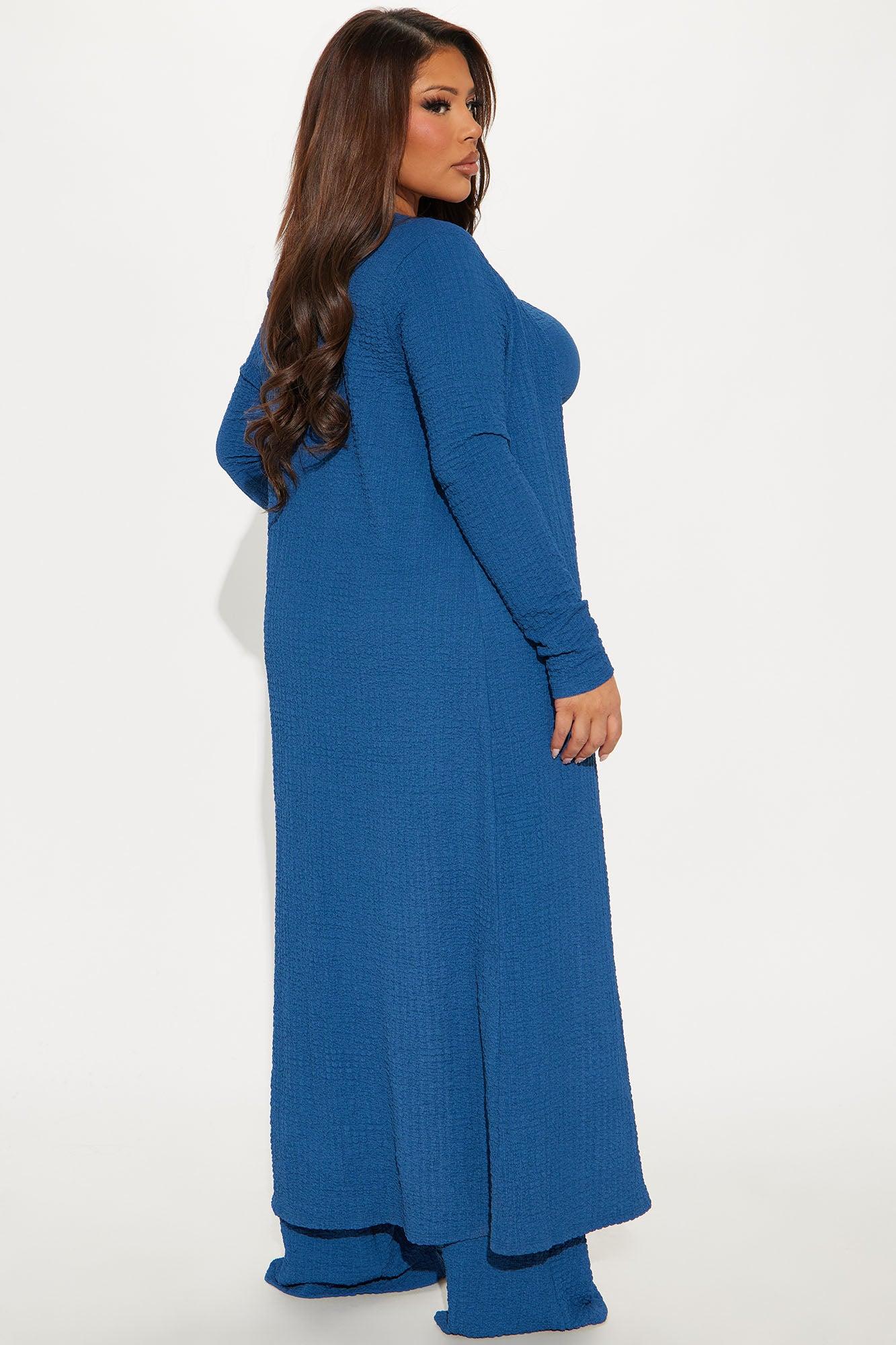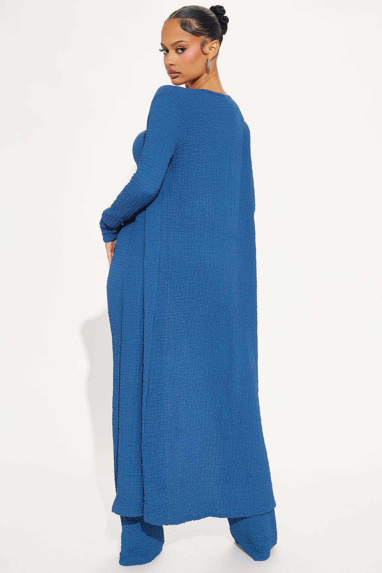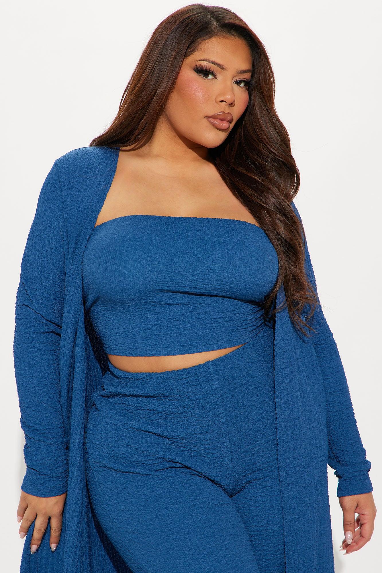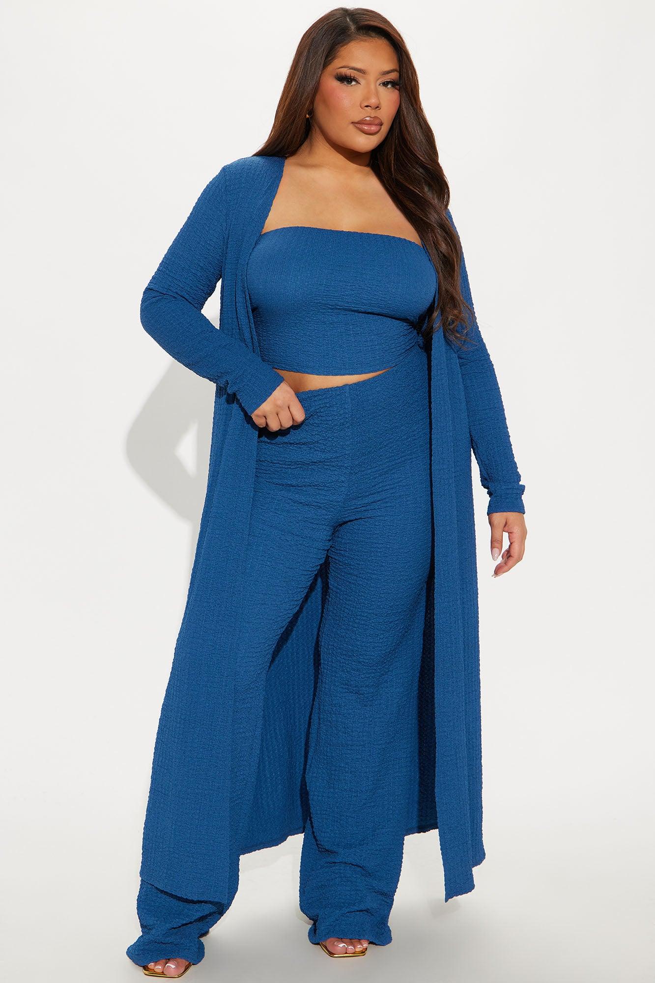 Available In Indigo And Rust. Tube Top, Long Cardigan, and Pant Stretch Regular 34" Inseam 3 Piece Ensemble Elastic Waistband 95% Polyester 5% Spandex Imported