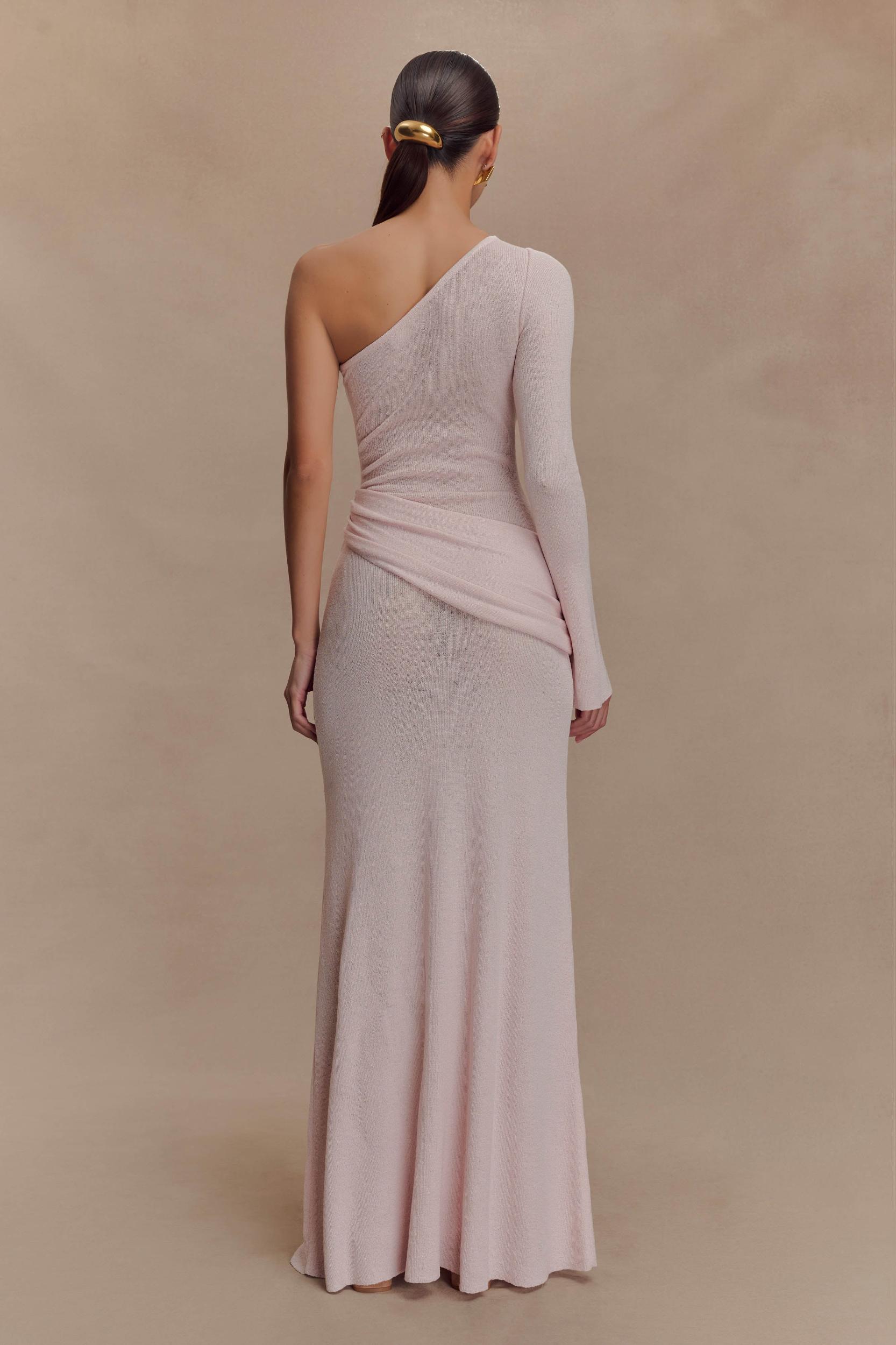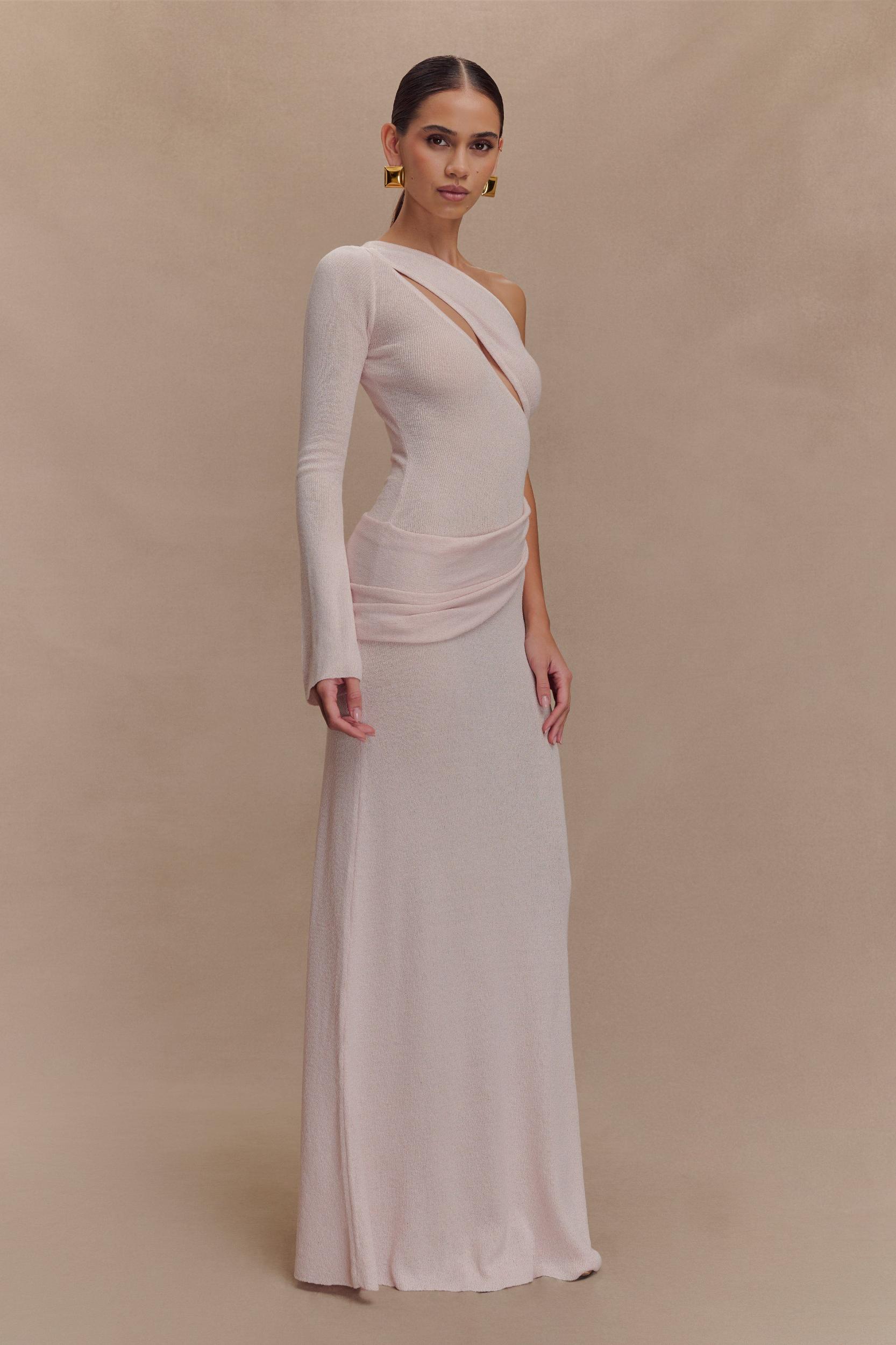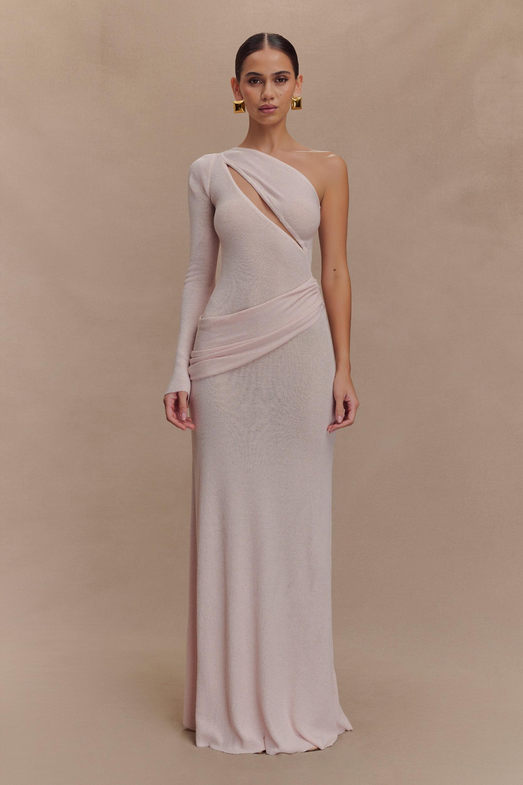 Sculpted stretch for city nights. The ALEXIUS One Shoulder Knit Maxi Dress is a striking blend of modern design and comfortable knitwear. Featuring an asymmetrical neckline with a single long sleeve and front bust cutout, this fitted silhouette makes a confident statement. A gathered overlay panel drapes across the hip for added texture and movement, while the unlined knit keeps it lightweight and body-hugging. Finished in a maxi length, this dress is the perfect piece for elevated evenings, standout events, or any moment that calls for soft structure and strong style.