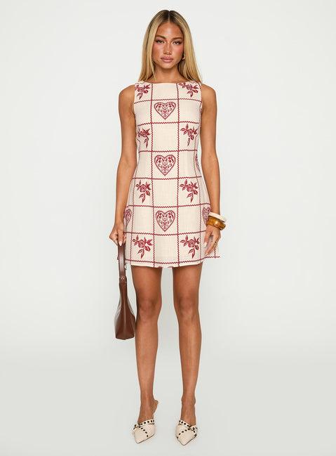 Floral check print, boat neckline, hook & invisible zip fastening at back, tie-back fastening
