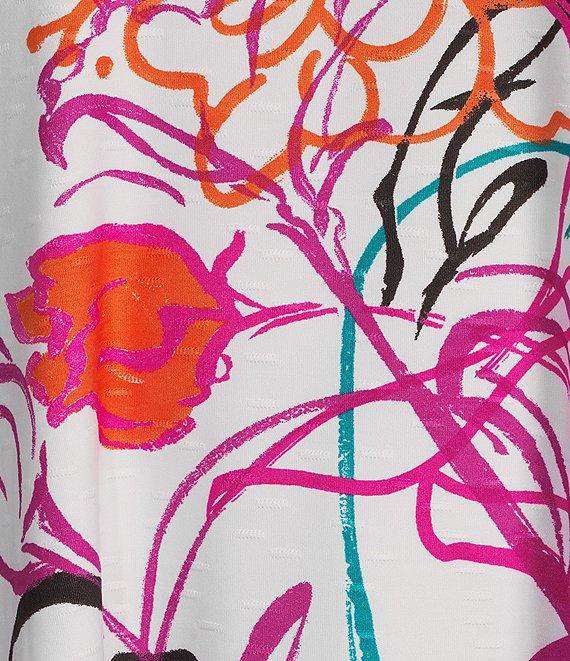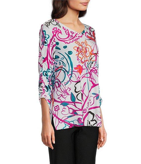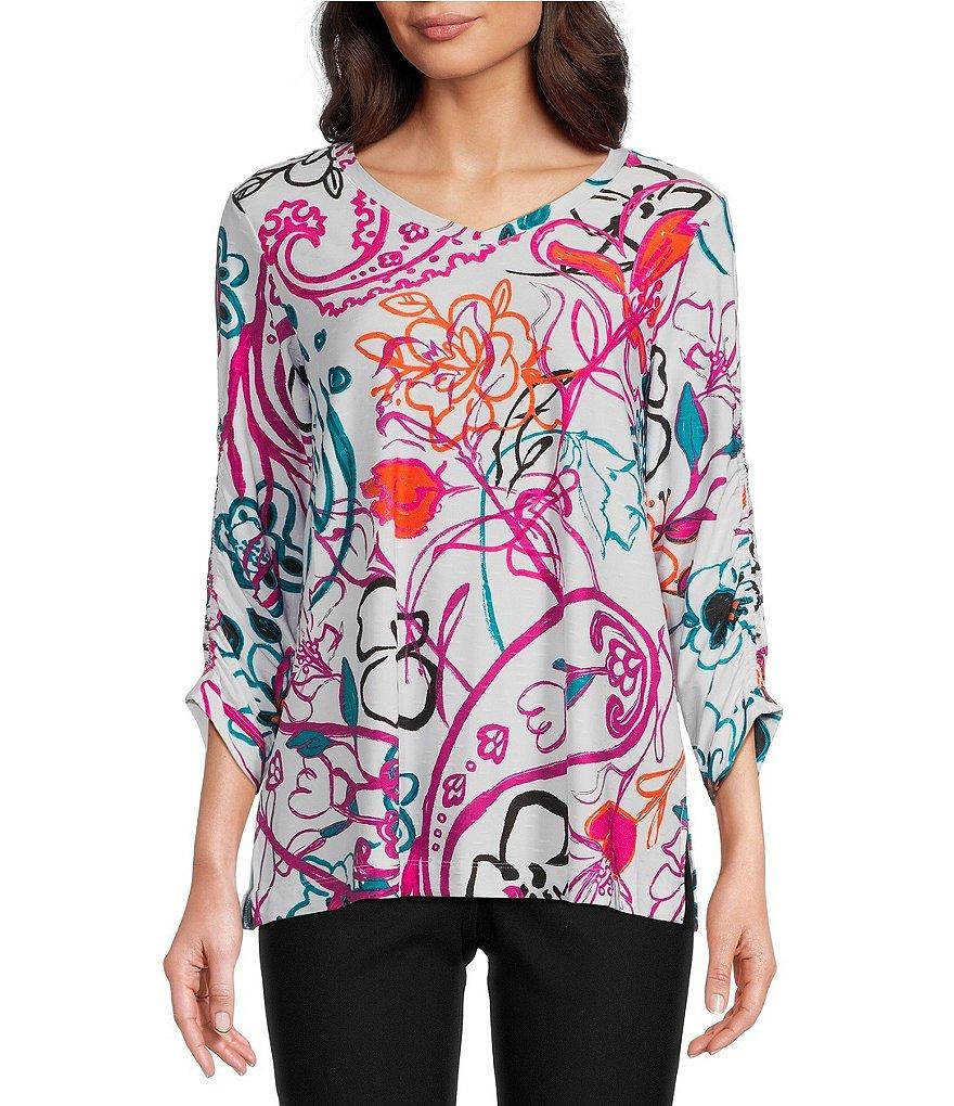 From Ali Miles, this tunic features: Floral abstract print V-neckline 3/4 cinch sleeves Pullover construction Approx. 27" length Polyester/spandex Machine wash cold/tumble dry low Imported.