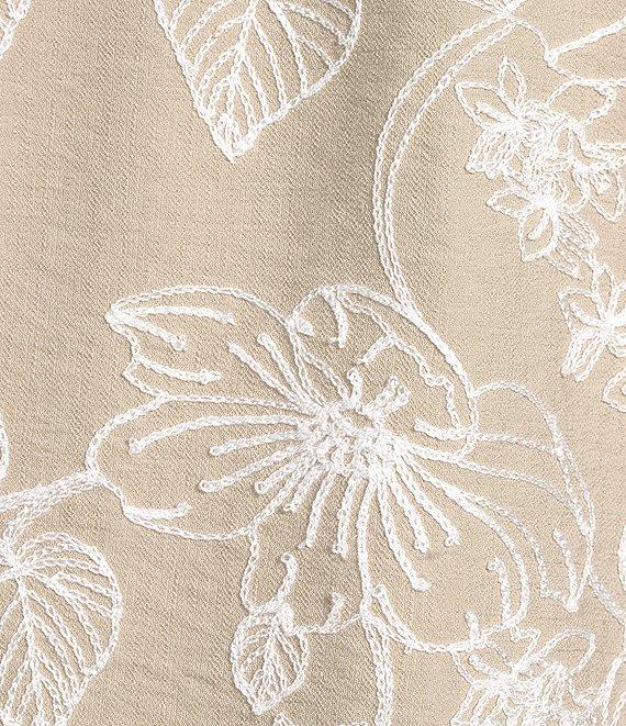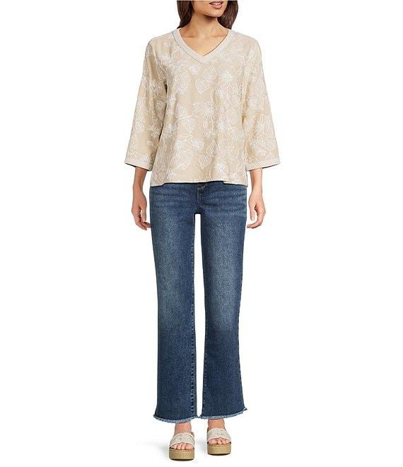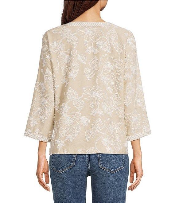 From Ali Miles, this tunic features: Woven fabrication V-neckline 3/4 sleeves Allover floral pattern embroidery Embroidery pattern on neckline and sleeve cuffs Straight hemline with side vents Pullover construction Approx. 25.5" length Rayon/nylon; exclusive of decoration Machine wash cold Imported.
