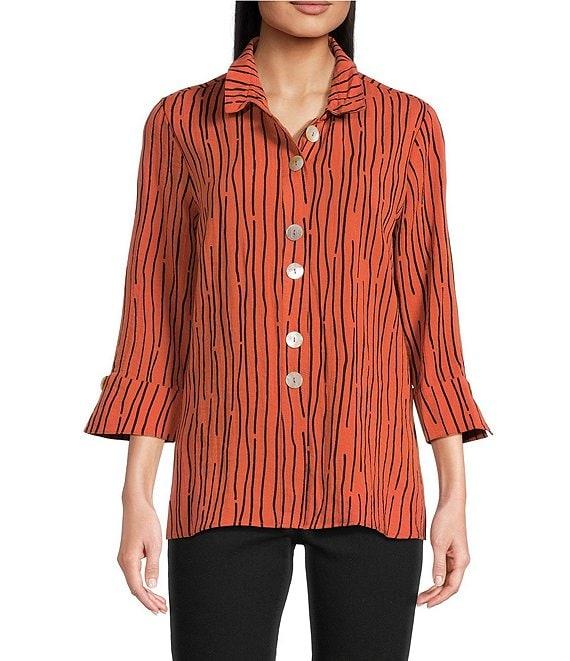 Ali Miles Crinkle Woven Abstract Stripe Wire Collar 3/4 Sleeve Button Front Tunic