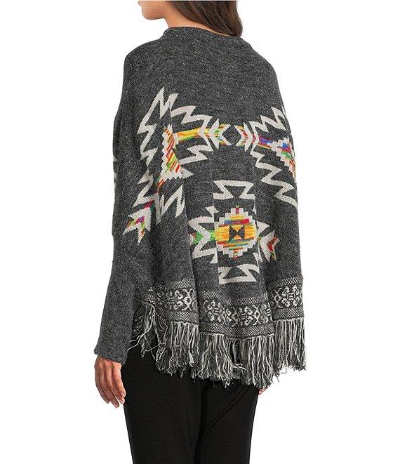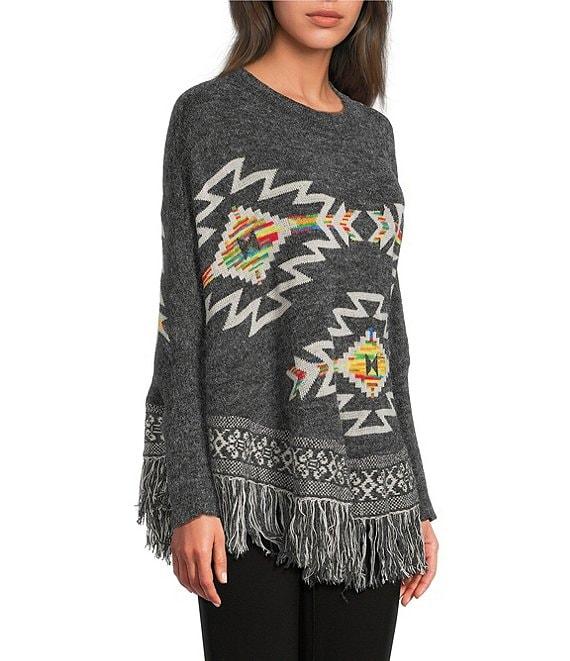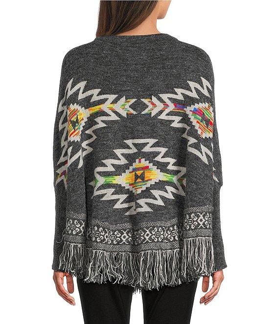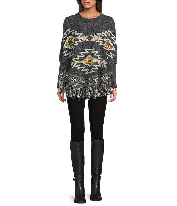 From Ali Miles, this poncho features: Jacquard knit fabrication Poncho silhouette Crew neckline 3/4 sleeves Pattern Curved hemline Fringe detail Pullover construction Approx. 24" length Acrylic/nylon/polyester/wool Machine wash gentle/tumble dry Imported.