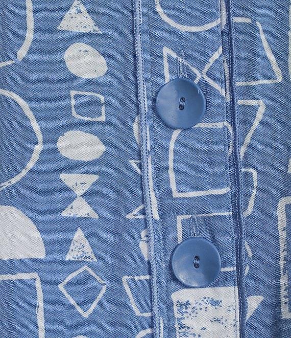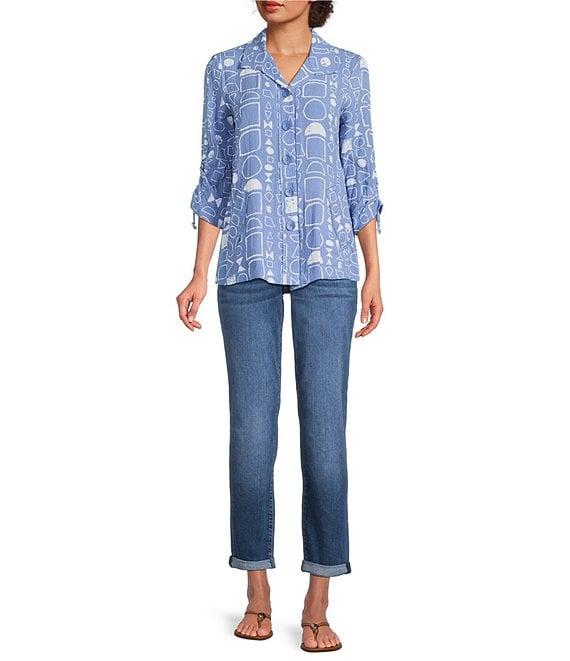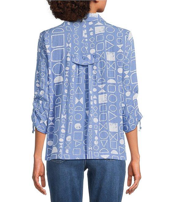 From Ali Miles Petite, this tunic features: Woven fabrication Point collar 3/4 cinched sleeves All-over geo print Two front functional pockets Straight hemline Button front closure Approx. 24" length Rayon/nylon Machine wash/tumble dry low Imported.