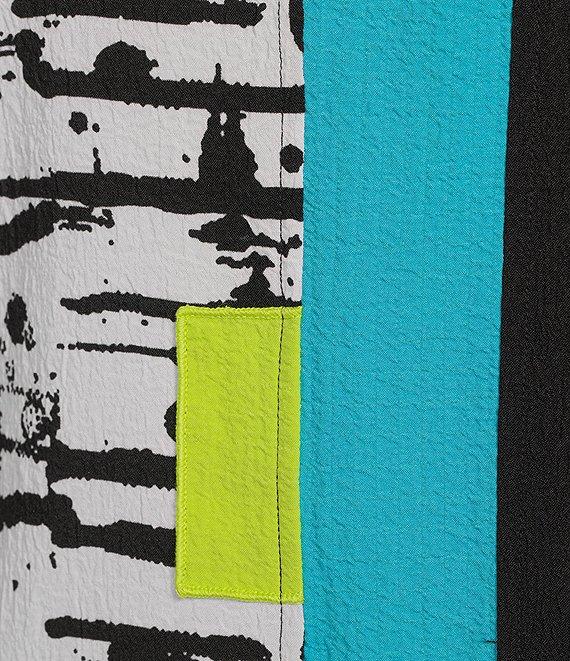 From Ali Miles, this top features: Mixed-media woven fabrication Round neckline 3/4 sleeves Abstract print with solid panels Functional side pockets Straight hemline Pullover construction Approx. 28" length Body: polyester/spandex; combo: polyester/rayon/spandex Machine wash/tumble dry Imported.