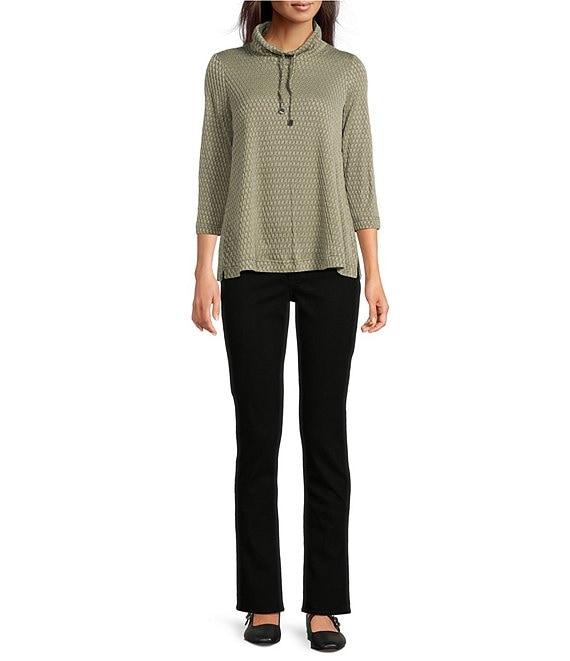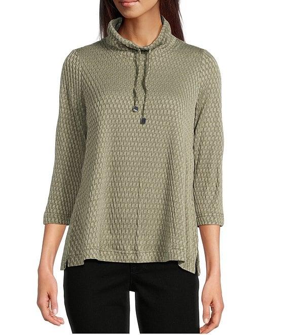 From Ali Miles Petite, this tunic features: Textured solid knit fabrication Cowl neckline with ties 3/4 sleeves Straight hem Pullover construction Approx. 24" length Polyester/rayon/spandex Machine wash/line dry Imported.