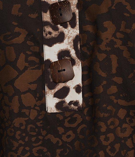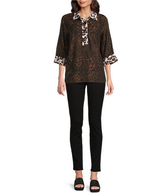 From Ali Miles Petite, this tunic features: Woven fabrication Point collar 3/4 cuff sleeves Animal print Contrast trim at collar and sleeves Back button detail Hi-low hemline with side vents Pullover construction Approx. 25" front length, 26" back length Cotton Machine wash cold/tumble dry low Imported.