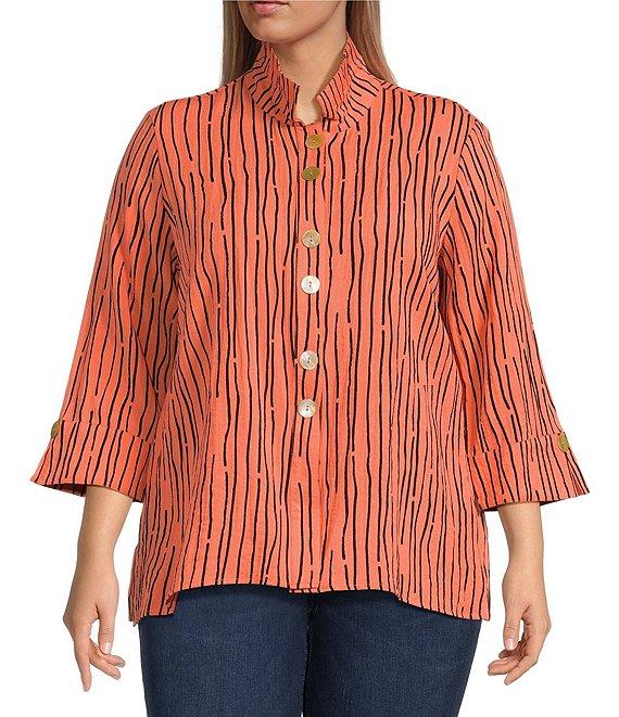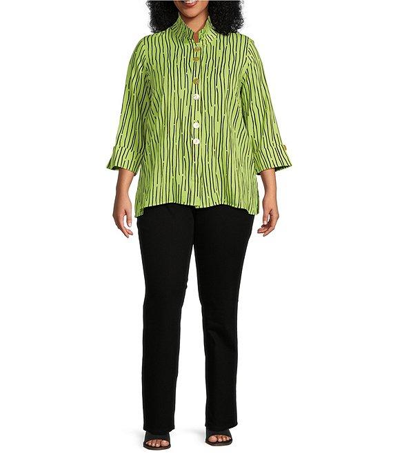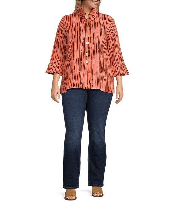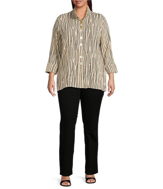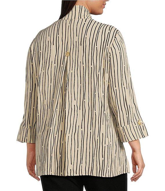 Ali Miles Plus Size Crinkle Woven Abstract Stripe Wire Collar 3/4 Sleeve Button-Front Tunic