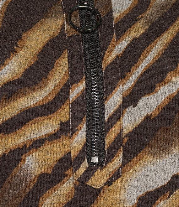 From Ali Miles Plus, this tunic features: Knit fabrication Point collar Long roll-tab sleeves Zebra print Front pockets Straight hem Pullover with a quarter-zip closure Approx. 28" length Polyester/spandex Machine wash/tumble dry low Imported.