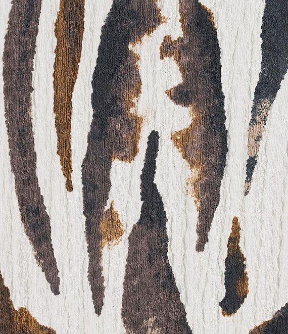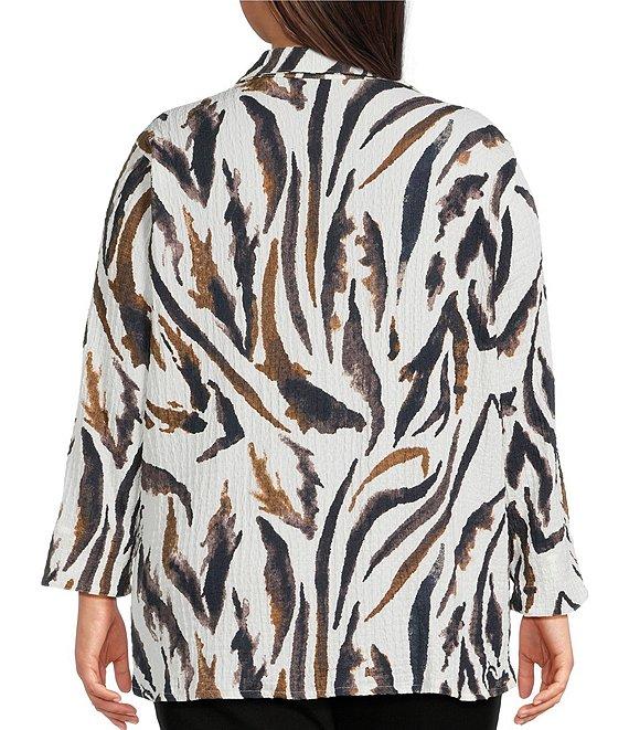 From Ali Miles Plus, this tunic features: Textured knit fabrication Point collar 3/4 sleeves Zebra print Hi-low hem Button-front closure Approx. 28" center front length, 29.5" center back length Polyester/spandex Machine wash cold/tumble dry Imported.