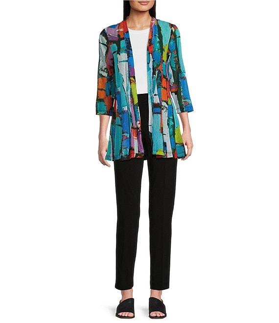 From Ali Miles, this kimono features: Open neckline 3/4 sleeves Abstract print Straight hemline with mesh insets Open-front; no closure Approx. 30" length Polyester/spandex Machine wash/tumble dry Imported.