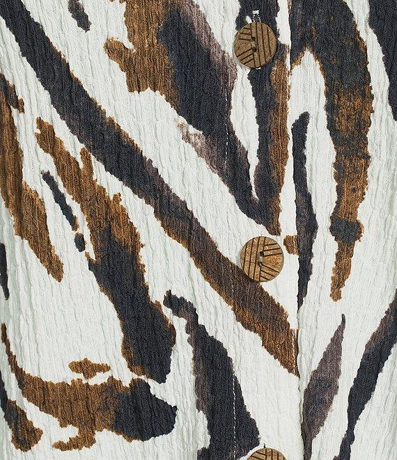 From Ali Miles, this tunic features: Textured knit fabrication Point collar neckline 3/4 sleeves Zebra print Hi-low hem Button-front closure Approx. 27" center front length, 28.5" center back length Polyester/spandex Machine wash cold/tumble dry low Imported.